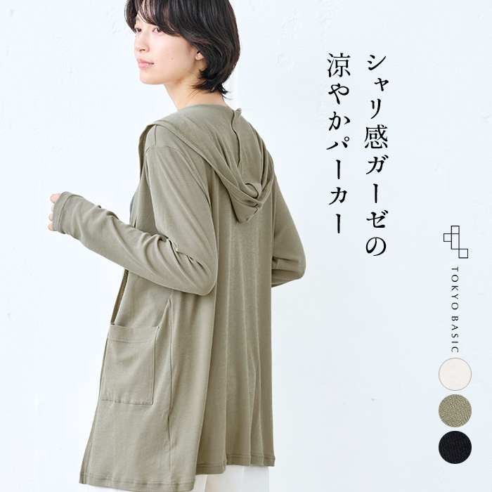 シャリ感ガーゼの涼やかパーカー。日除けや冷房対策にサッと羽織れる、綿100%快適薄手ガーゼ。シャリ感のある、さらりとした肌触りの強撚ガーゼ生地を使用した着流しロングパーカーカーデ。日除けにも、冷房対策にも、屋外でも、屋内でも大活躍の一枚。ルームウェアでちょっとそこまでお出かけという時にも、ボタンがない着流しデザインなので、気軽にサッと羽織れて便利です。