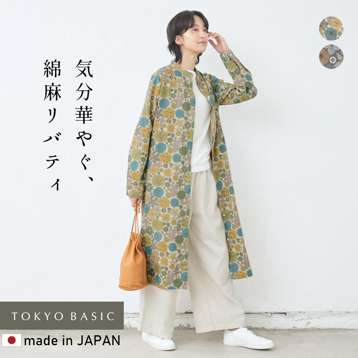 長袖ワンピース レディース リバティ リネンコットン バンドカラー ワンピース 日本製 長袖 秋ワンピース 秋 ロング