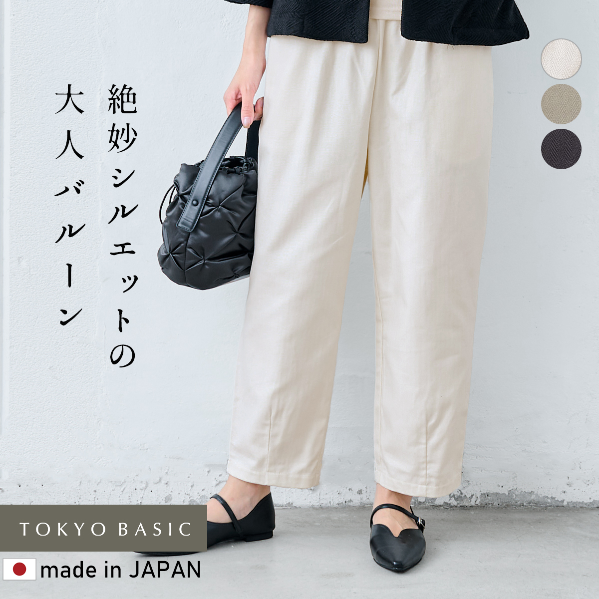 TOKYO BASICの大人気アイテムとなっている、セミワイドパンツと同じ素材で、バルーンパンツを作りました。しっかり厚手のコットンヘリンボンは、織りで表現したヘリンボン柄がさりげなく上品な印象で、穿くたび、洗うたびに、穿きやすく馴染んでくれます。膨らみ過ぎない絶妙バルーンシルエットで、短め丈で抜け感があり、キレイめに着こなせる、大人の為のバルーンパンツです。
