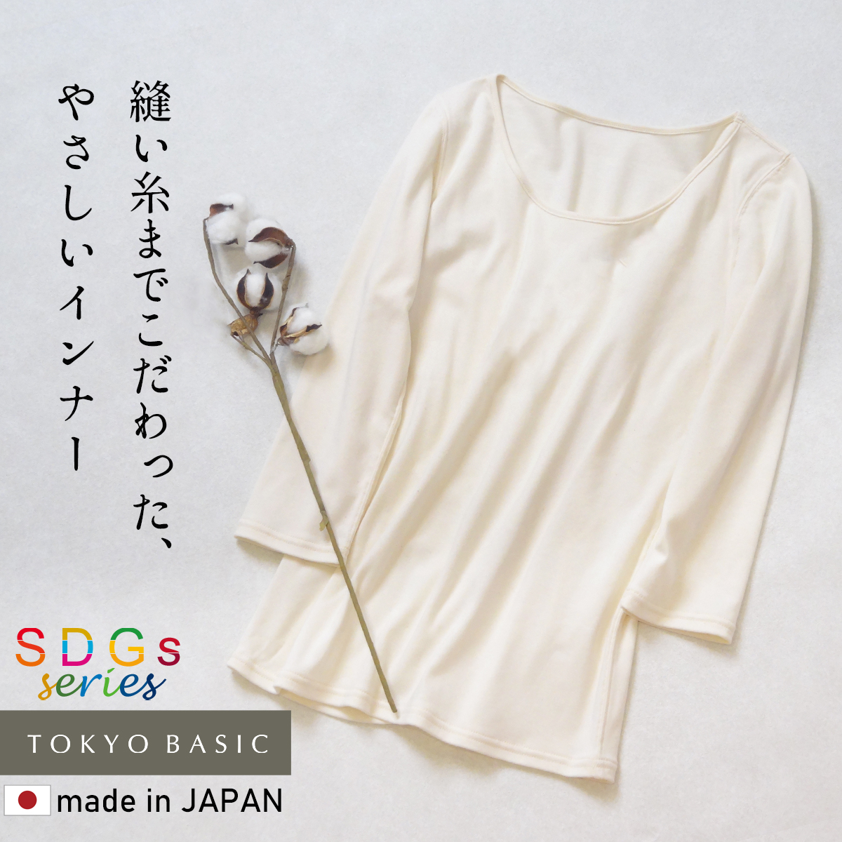 縫い糸までこだわった、やさしいインナー。肌に触れるものは、やさしいコットンにこだわりたい。オーガニックコットンで編み立てた生地を、染色せずそのまま使用した、素材本来の色を愉しめる、地球にもお肌にもやさしいインナー。縫い糸もコットンでコーティングされたものを使用し、お肌に触れる部分は、綿でできているので化繊が苦手な方にも安心してお試しいただけます。インナーとして使い勝手の良い、七分袖に仕上げました。