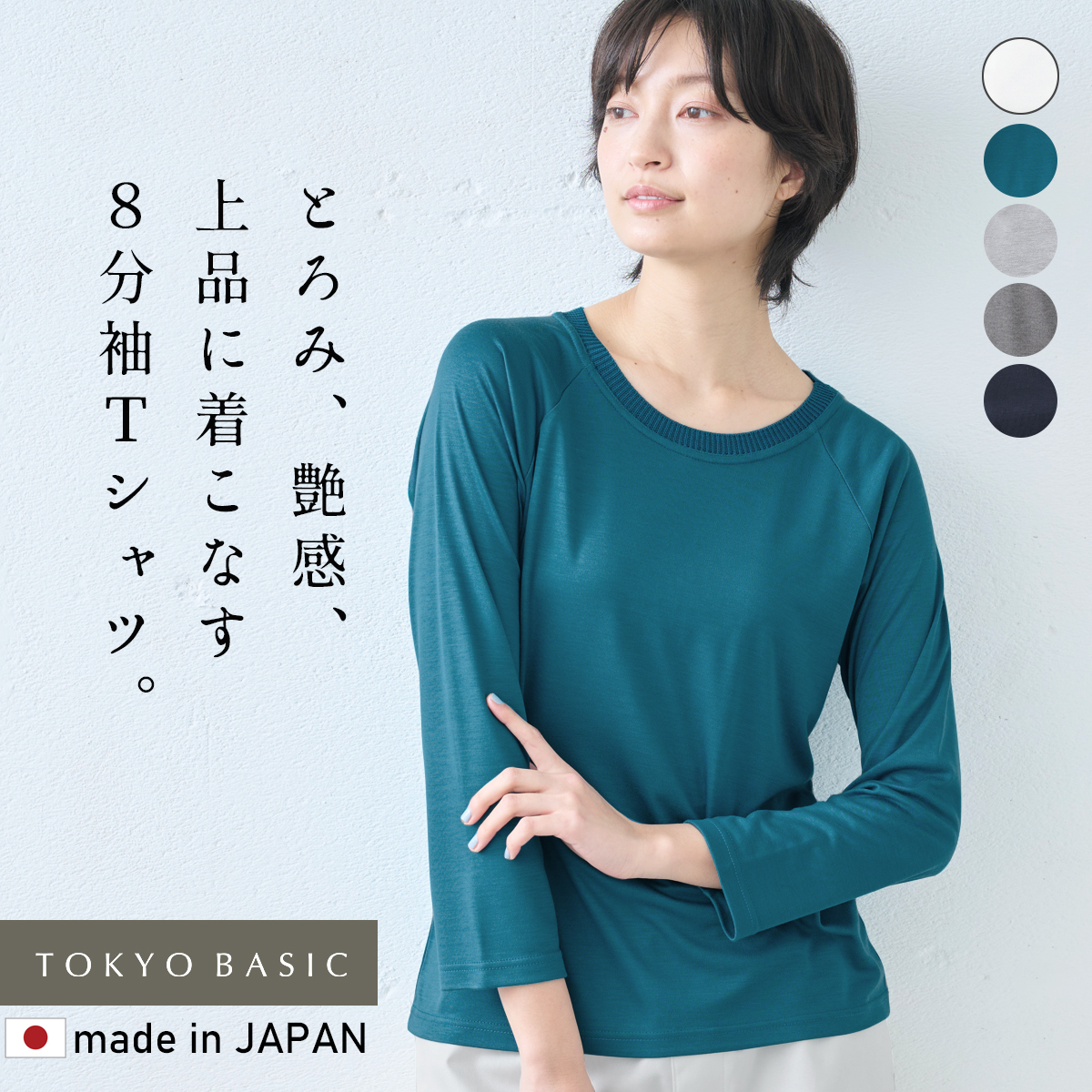 ビスコースレーヨンのとろみと艶感に、リヨセルのナチュラルな風合いと吸湿性を加えた、シルクのような肌触りの、大人に似合う8分袖ラグランTシャツ。シンプルで着回しやすく、ネック部分には、同系色のリブ素材を使用し、品のある印象をプラスしています。しっとりと落ち感がありながらも、さらりとした着心地で、ロングシーズン快適に着用できます。