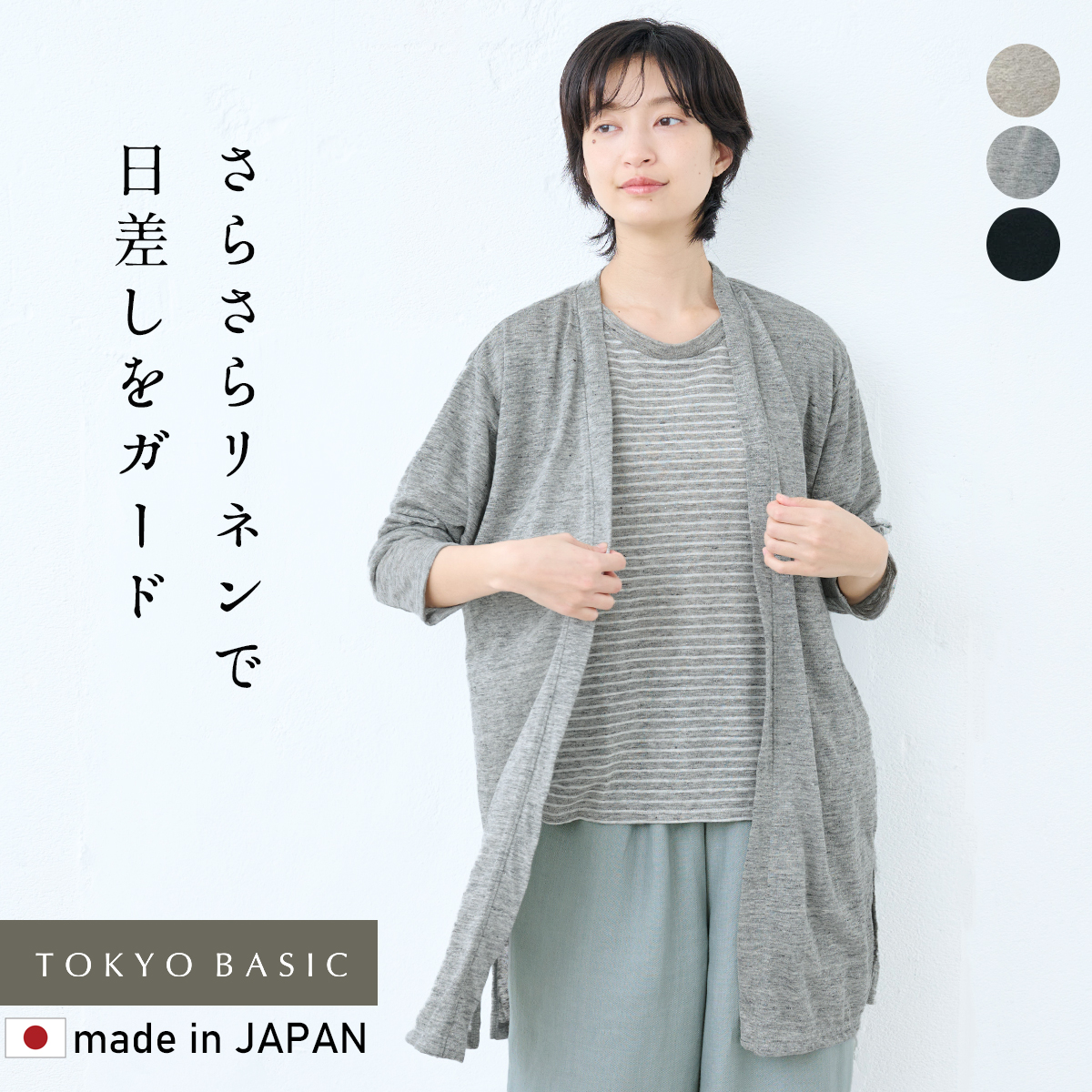 さらさらリネンで日差しをガード。プレミアムリネンが叶える、着て涼む、紫外線対策。とにかく涼しい着心地が人気のプレミアムリネンのカーデ。今回は、身丈を少し長めにつくり、ボタンなしの着流しスタイルのサッと羽織れるカーデに仕上げました。風通しよく、さらりとした肌触り、吸放湿性に優れたプレミアムリネンだから、暑い季節に日除けとしてこの上なく快適な着心地。他にも室内での冷房対策、旅先で肌寒い夜に、何かと活躍してくれる一枚です。