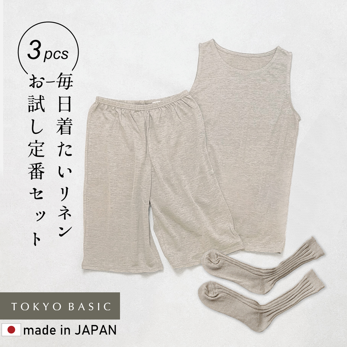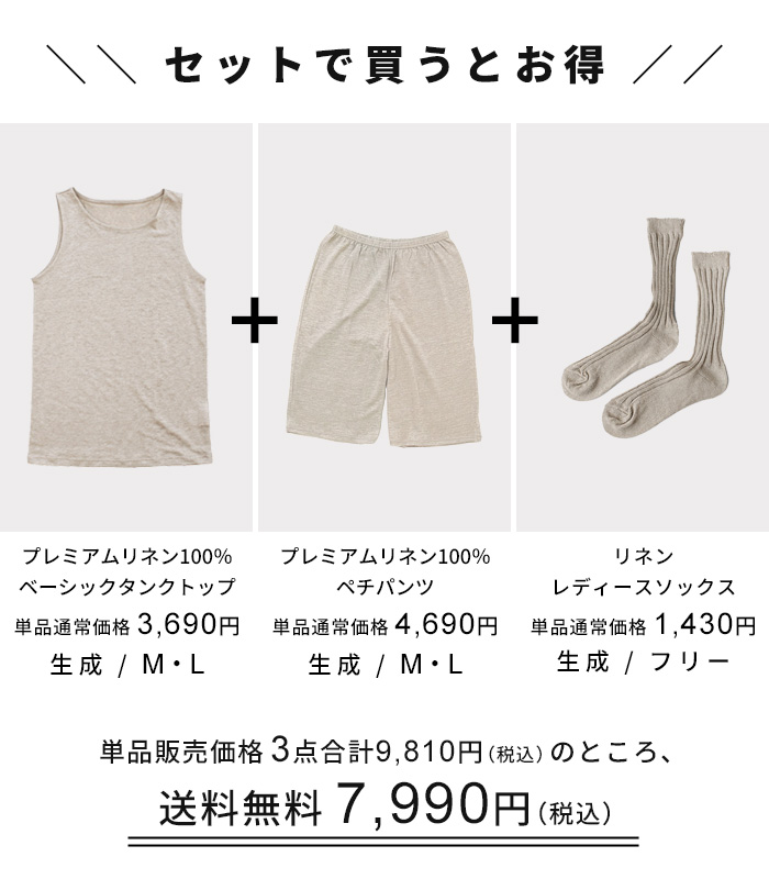 お試しセット レディース リネン 夏 日本製 3点セット プレミアムリネン100% ベーシック タンクトップ + ペチパンツ & リネンソックス 速乾 抗菌