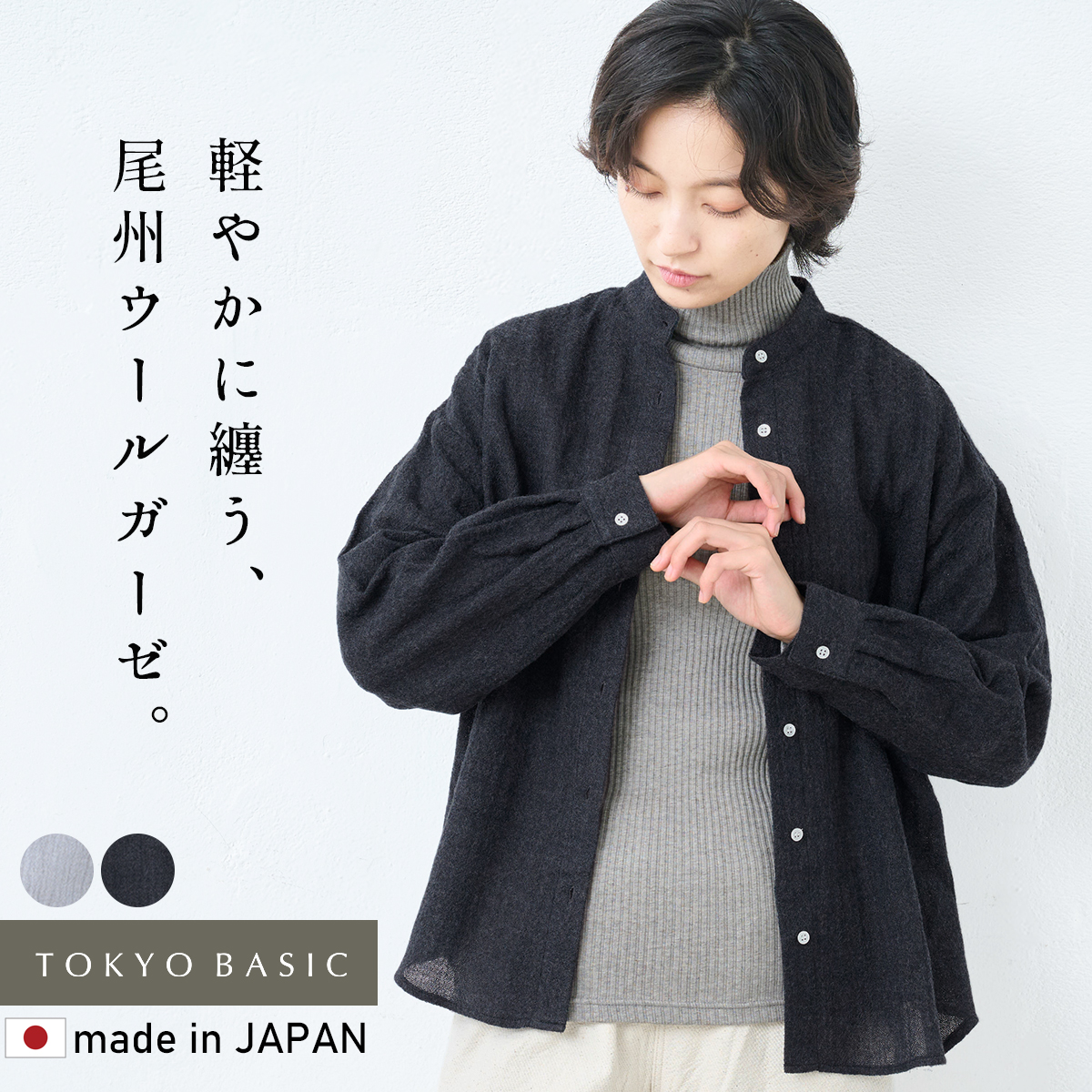 軽やかなウールガーゼ素材で仕立てた、長袖のバンドカラーシャツ。上質な尾州ウール100%を使用し、チクチクしにくく、通気性がよく、秋冬から春先までロングシーズン快適。ほどよい透け感とふんわりとした風合いで、上品さと抜け感を両立。1枚ではもちろん、羽織りとしても、カーディガンやニットのインナーとしても活躍。シンプルで合わせやすく、大人ナチュラルなコーディネートにぴったりのウールシャツです。日本製の丁寧なつくりで、きれいめにもカジュアルにも使える万能アイテム。