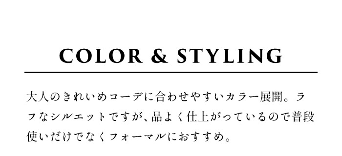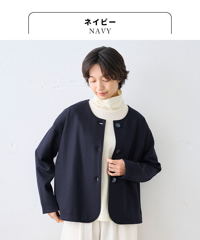 ほどよくゆったり品よく着映え。フォーマルもカジュアルもゆったり上品ノーカラー。卒業式や入学式など、きちんと感が求められる場に安心して着られるノーカラージャケット。圧縮ウールの程よい厚みが身体のラインを拾いにくく、ゆったりとしながらも品よく着映えします。当店のジャケットでは珍しい裏地付き仕様で、袖通しがよく、長時間の着用も快適。式典はもちろん、通勤やきれいめな日常スタイルまで幅広く活躍する一着です。