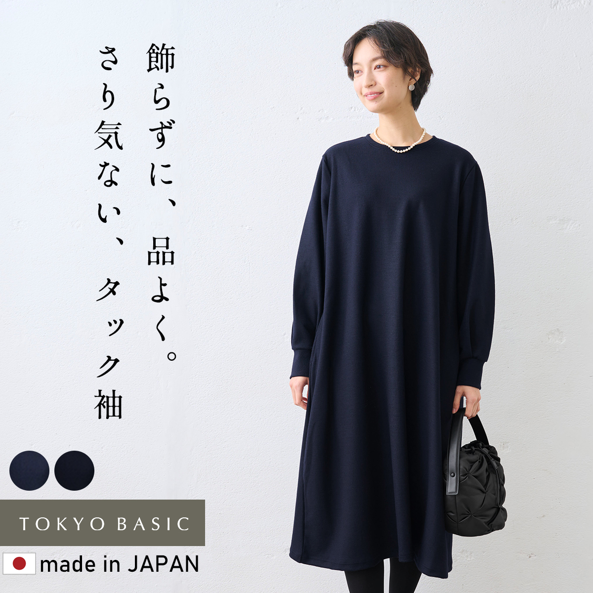 ロングワンピース レディース 長袖 圧縮ウール100% クルーネック 袖タック ワンピース 日本製 秋 冬