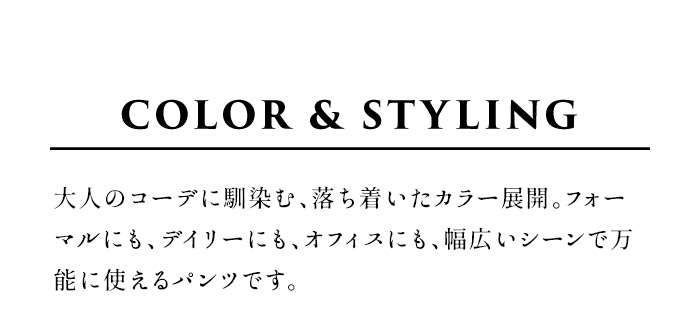 ウール混素材ならではの上品な風合いと、360度ストレッチの快適なはき心地を兼ね備えたストレートパンツ。動きに合わせてしなやかに伸び、長時間の着用でも窮屈感がなく、美しいシルエットをキープします。身体のラインを拾いにくく、きれいめにもカジュアルにも対応。通勤や日常使いはもちろん、同素材のジャケットと合わせれば、卒業式・入学式などのフォーマルシーンにも活躍する一本です。