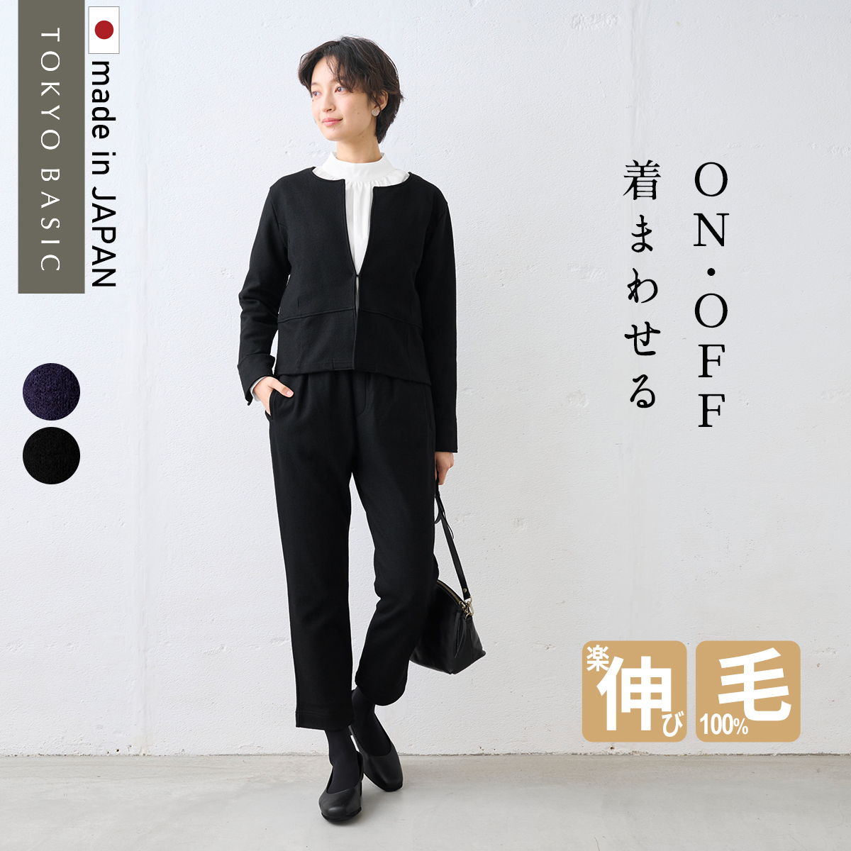 上質な圧縮ウール100%で仕立てた、ノーカラージャケットとアンクルパンツの2点セット。軽くて暖かいので、秋冬春の3シーズン着用でき、通勤やオフィス、フォーマルシーンにもおすすめ。ノーカラージャケットは縦に流れるラインですっきりと上品に見せ、アンクルパンツは程よくスリムできれいめコーデにぴったり。セットで着れば大人の上品な佇まいを演出し、単品でも着回し力抜群。卒業式・入学式・入園式・卒園式・セレモニーなどのフォーマルシーンにも対応。