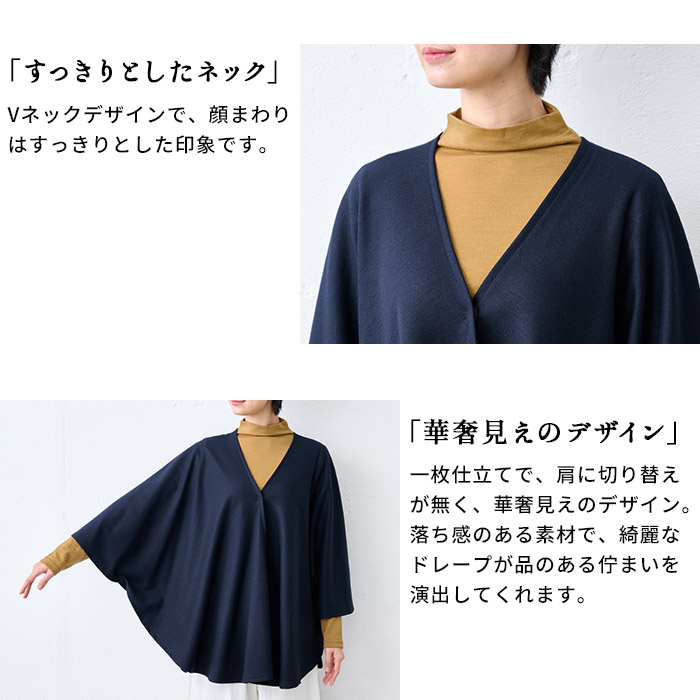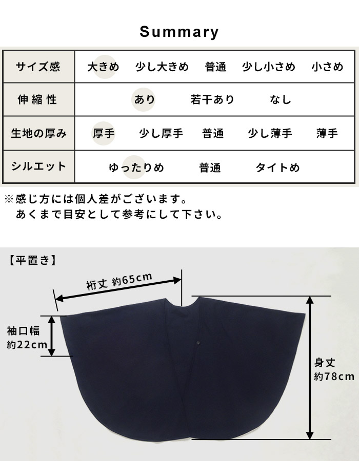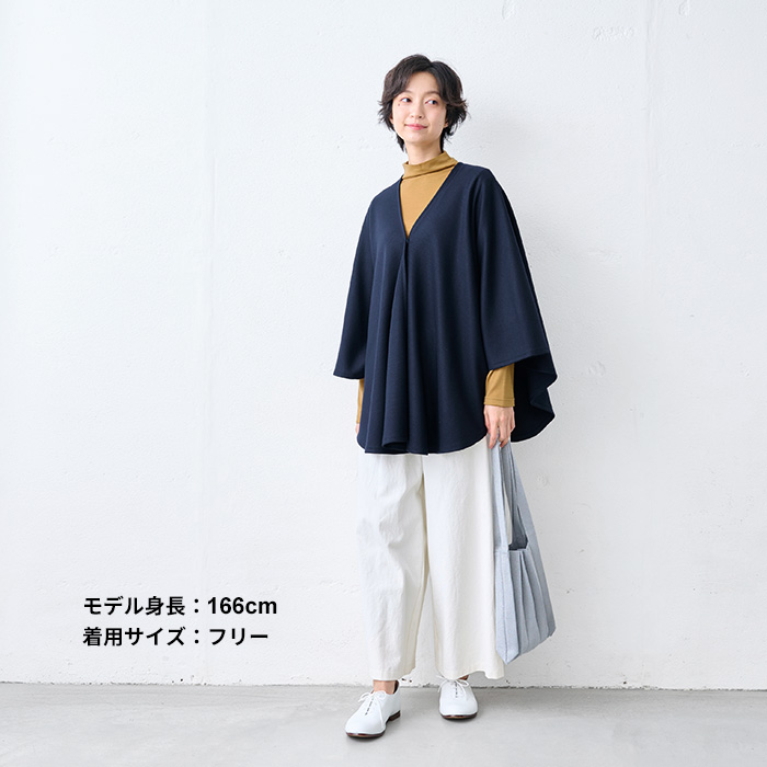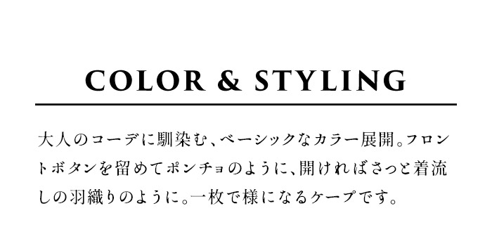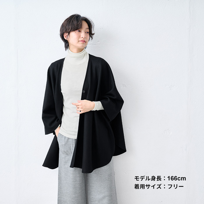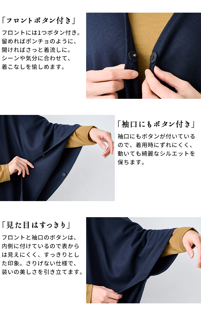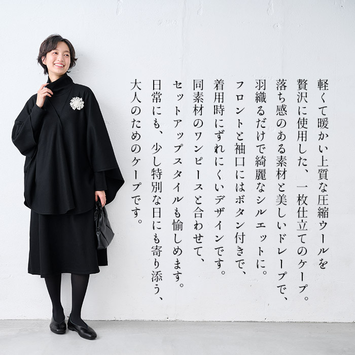圧縮ウール100%を使用した、軽くて暖かいボタン付きケープ。生地をたっぷり使った一枚仕立てで、ポンチョ風に身体を包み込むラウンドシルエットです。ゆったりとした着心地で体型カバーにも。フロントボタンを留めてポンチョ風に、開けて着流しても。同素材のワンピースと合わせたセットアップ対応。通勤や入学式・卒業式・結婚式など、フォーマルシーンにも使えます。