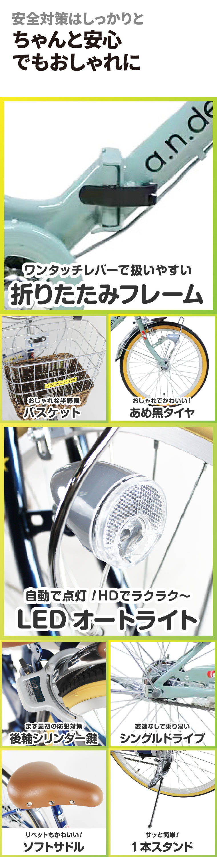 | ちゃんと安全に。でもおしゃれに。 HD(ハブダイナモ)LEDオートライトなど安全対策もピカイチ。 キッズバイクに絶対必要な後輪錠、ベル、スタンド、リフレクター(反射板)など便利はしっかりと。 さらにびょう付きサドル、藤風ワイヤーカゴ、アメ黒タイヤなどなどおしゃれでかわいいコトをこれでもか!っと詰め込んでいます。 おしゃれも、ちゃんと安全も。 |