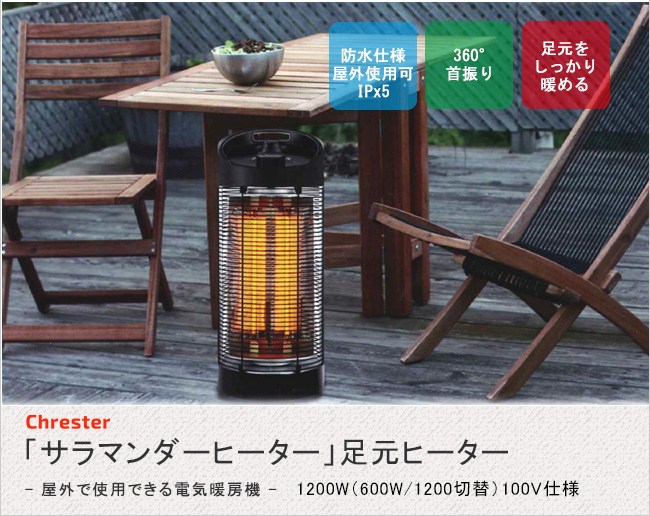 クレスター(Chrester)サラマンダーヒーター(足元専用ヒーター)HEAT-Z-121B 屋外で使用できる電気暖房機【防水仕様(IPx5) 、1200W(600W/1200W切替) 100V仕様、360°首振り】