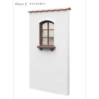 上品な手塗りの壁に笠木を組み合わせたフレンチシックなデザインウォール。小さなニッチ窓にアイアン調のフィックスフェンスと木調の棚を付けたおしゃれな壁です。