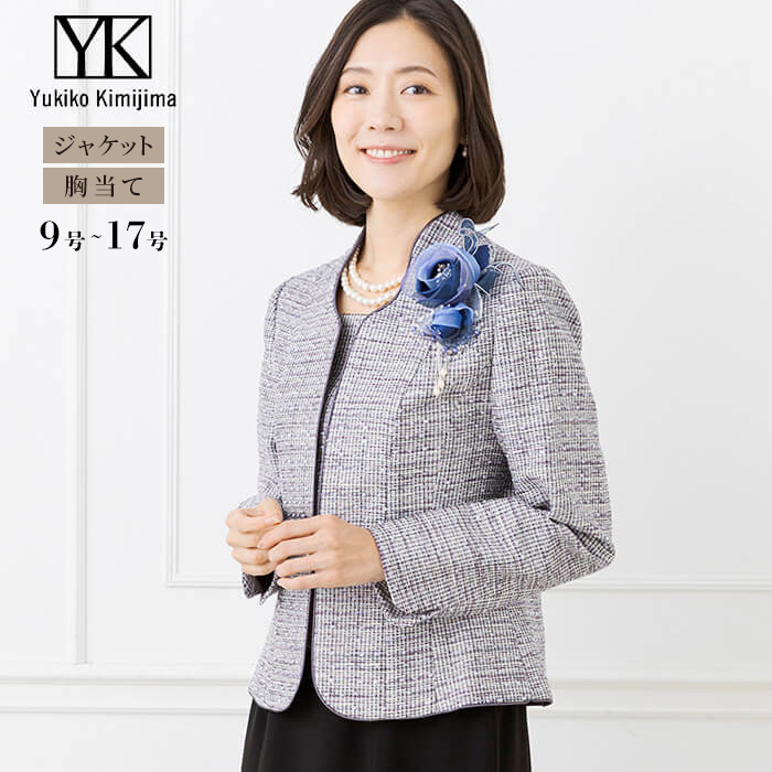 ジャパニーズエレガンスを表現するユキコキミジマらしい上品なジャケットスタイル。丁寧に織り上げたジャカード素材で贅沢に仕立てた大人の装いです。白と黒の織地にパープル系の糸を織り込んだ米沢織のジャカード素材で仕立てたジャケットは、優しい色合いで気負わず着ることができます。襟はゆるやかにカーブを描き、後ろに少し立ち上がりのあるデザイン。襟ぐりから前端、裾にまでコードハイピングを施し、すっきりしたデザインに仕上げました。フロントには華やかな飾りボタンが付いており、ロックホックで留める仕様となっています。取り外し可能の胸当てが付いているので、スカートだけでなくワンピースにもコーディネートできます。結婚式のお母様やご親族なら、ロング丈と合わせた格調高いスタイルで、合わせるコサージュはブルー系やパープル系がおすすめです。ミセス(40代〜)向け、「少しゆったり」パターンを使用。「標準」に比べてウエストを中心にゆとりを持たせています。