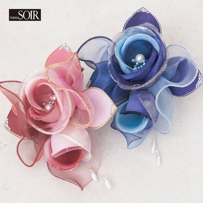 少しずつ変化した色味と素材を重ねあうことで立体感が生まれ、趣きのある佇まいに。ベーシックな形ながらも、印象深いコサージュに仕上げました。