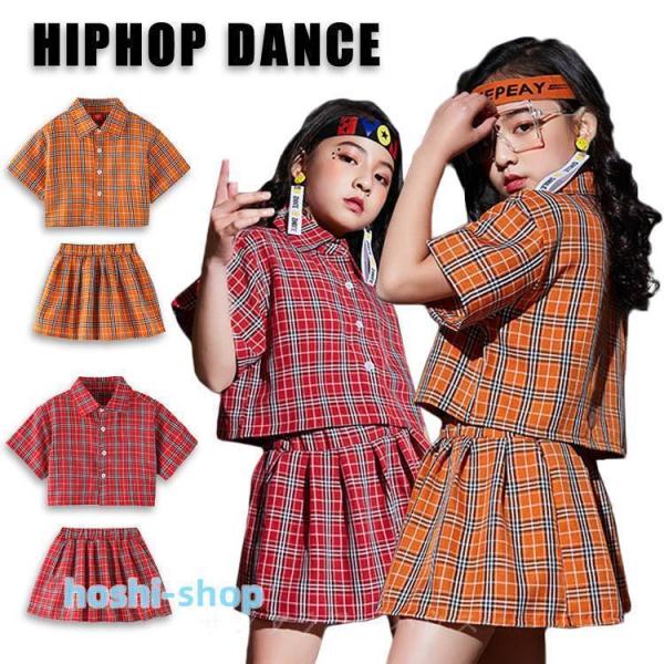 キッズ ダンス衣装 セットアップ スカート 半袖 チアガール ヒップホップ 女の子 HIPHOP 韓国 チェック ストリートダンス 発表会 110-180cm 上下セット