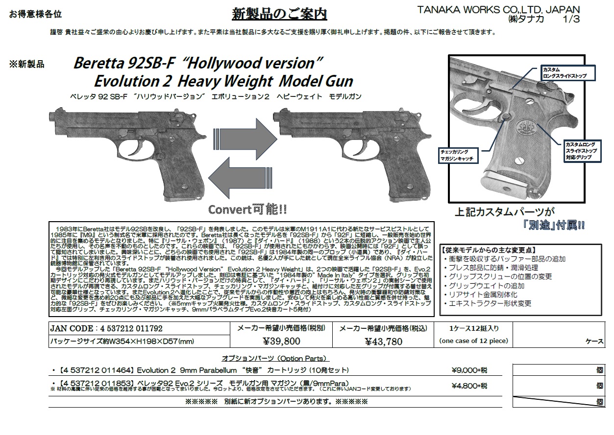 タナカ モデルガンベレッタ 92SB-F ハリウッドバージョン Evolution2 HW