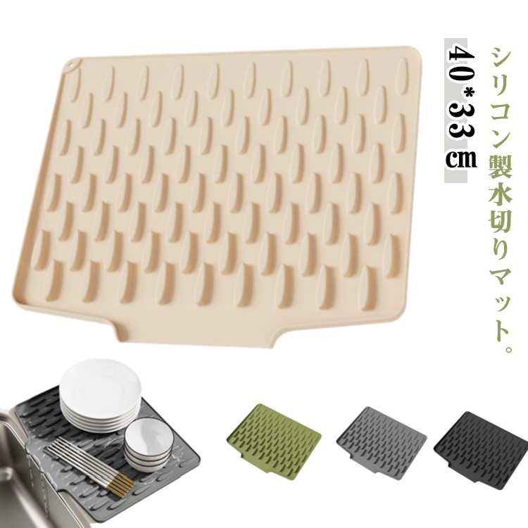 | シリコン製水切りマット。【40*33cm】 食器乾燥マット:水切りマットの表面は凸凹デザインで、空気の流通がよくて食器を乾燥しやすいです。簡単に水切りができるので、食器を拭く手間が省けます。 滑り止:食器 水切りマットがテーブルに密着してズレにくく、食器とテーブルトップの間の摩擦を減らし、食器とテーブルを効果的に保護できます。 多機能マット:水切りマットは調理台マット、テーブルマットとしても使える。ペットフードボウルや植木鉢の下にも置きます。耐熱230°C、熱い料理や鍋敷きにもご使用いただけます。 安全素材:食品級シリコン素材の特徴は抗菌仕様、無毒無臭、安心に使用いただけます。カップ、スプーン、お皿などのや洗った果物を置くのに適しています。サイズは30cm×20cmで、小鍋や小型ケトルの一時保管にも。 お手入れ簡単:水で直接洗い流すか、ブラッシングすることができます。マットに穴があり、吊り乾し可能です。丸めて収納も可能、収納便利。 | |