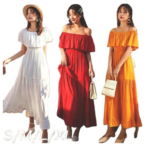 「当店」ハワイ リゾートワンピース 沖縄 リゾートワンピー 夏ワンピース オフショルダー マキシ丈 黄色 白 赤色レディース Aライン オフショル マキシワ