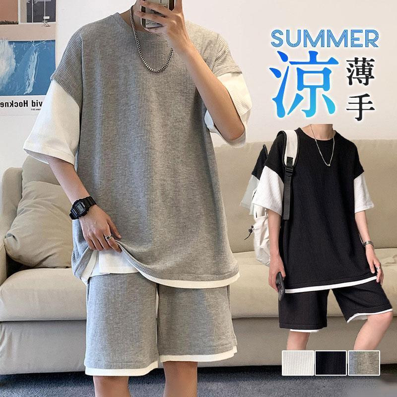 アップ メンズ 夏 上下セット 半袖 スウェット 薄手 ハーフパンツ フェイクレイヤード ルームウェア 部屋着