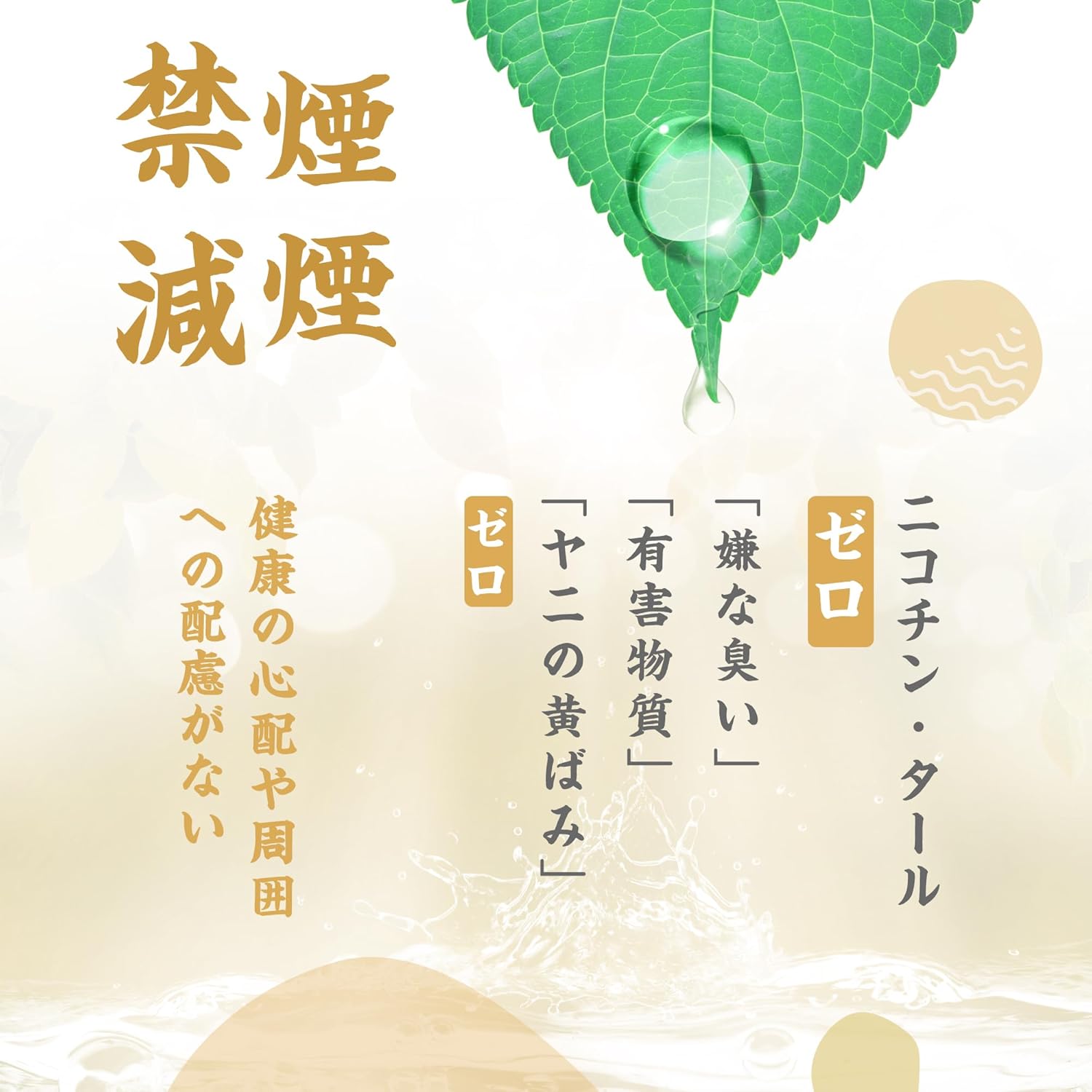| 健康面にこだわり | ニコチン・タールなし 天然植物成分を搾り取る、一切有害成分を使用なし。 体に優しい、禁煙や減煙を考えてる方にもオススメです。 |