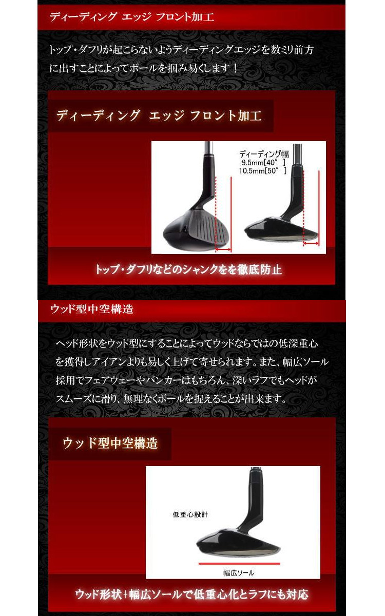 残り60ヤード以内のグリーン周りをミスなくカンタンに攻略できる易しいチッパーです。ウッド形状によるハイロフト設計とネック周りにシャンク防止設計を施し確実なアプローチを可能にしました。