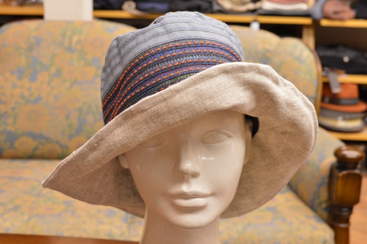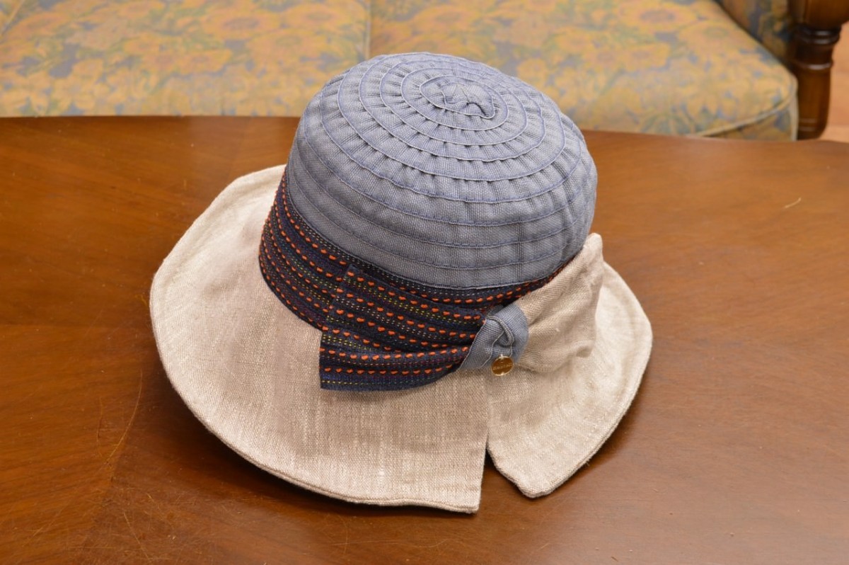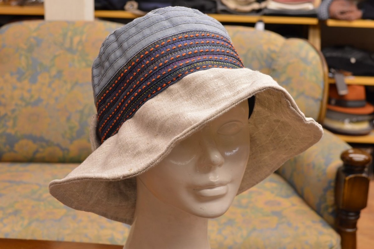クラウン部分はブレード編み、ブリム部分は麻素材を使用したワイヤーブリム仕様で、デザインクロッシェならではのラインフォルムが独特な雰囲気をかもし出します。