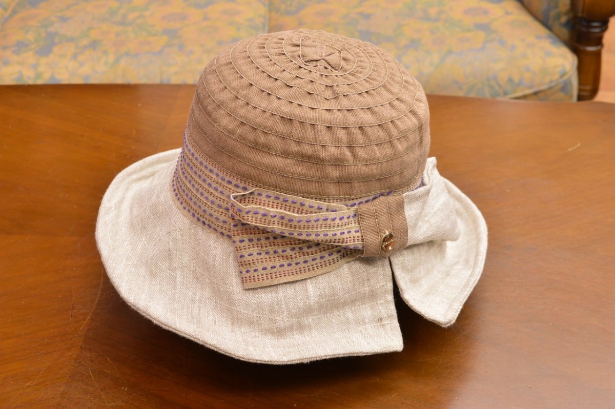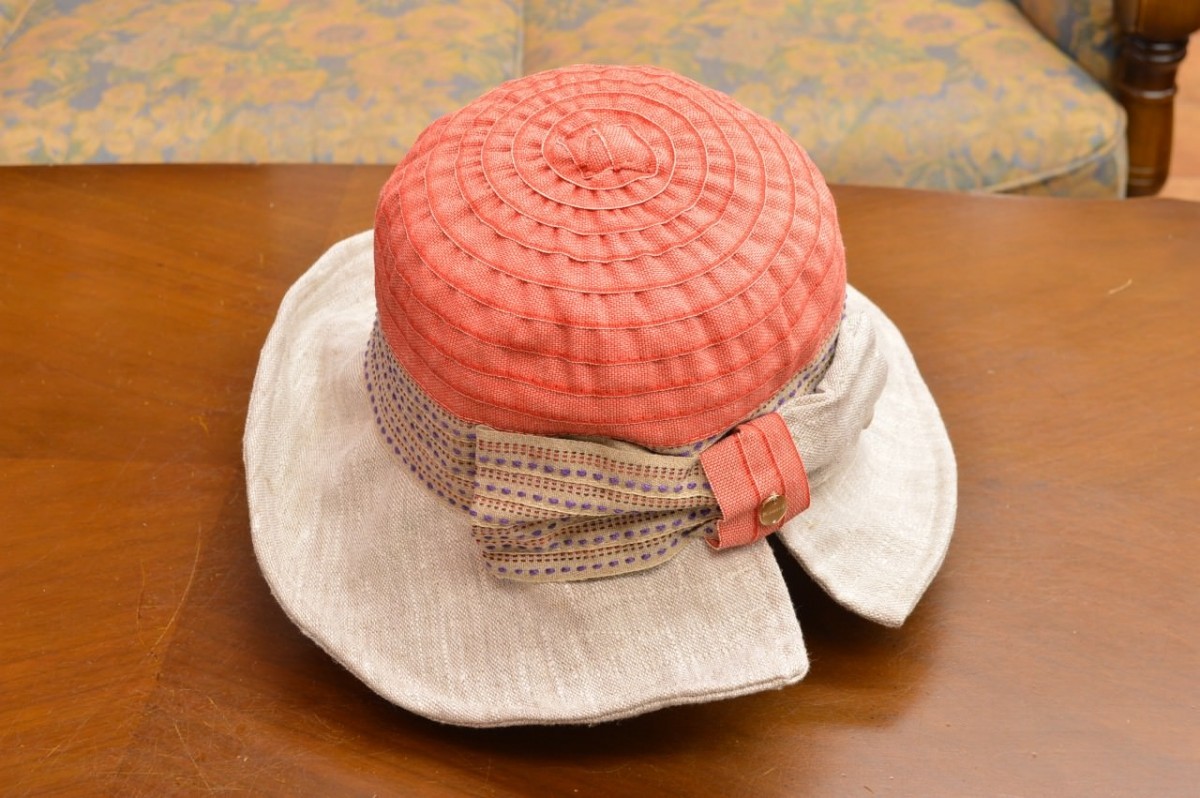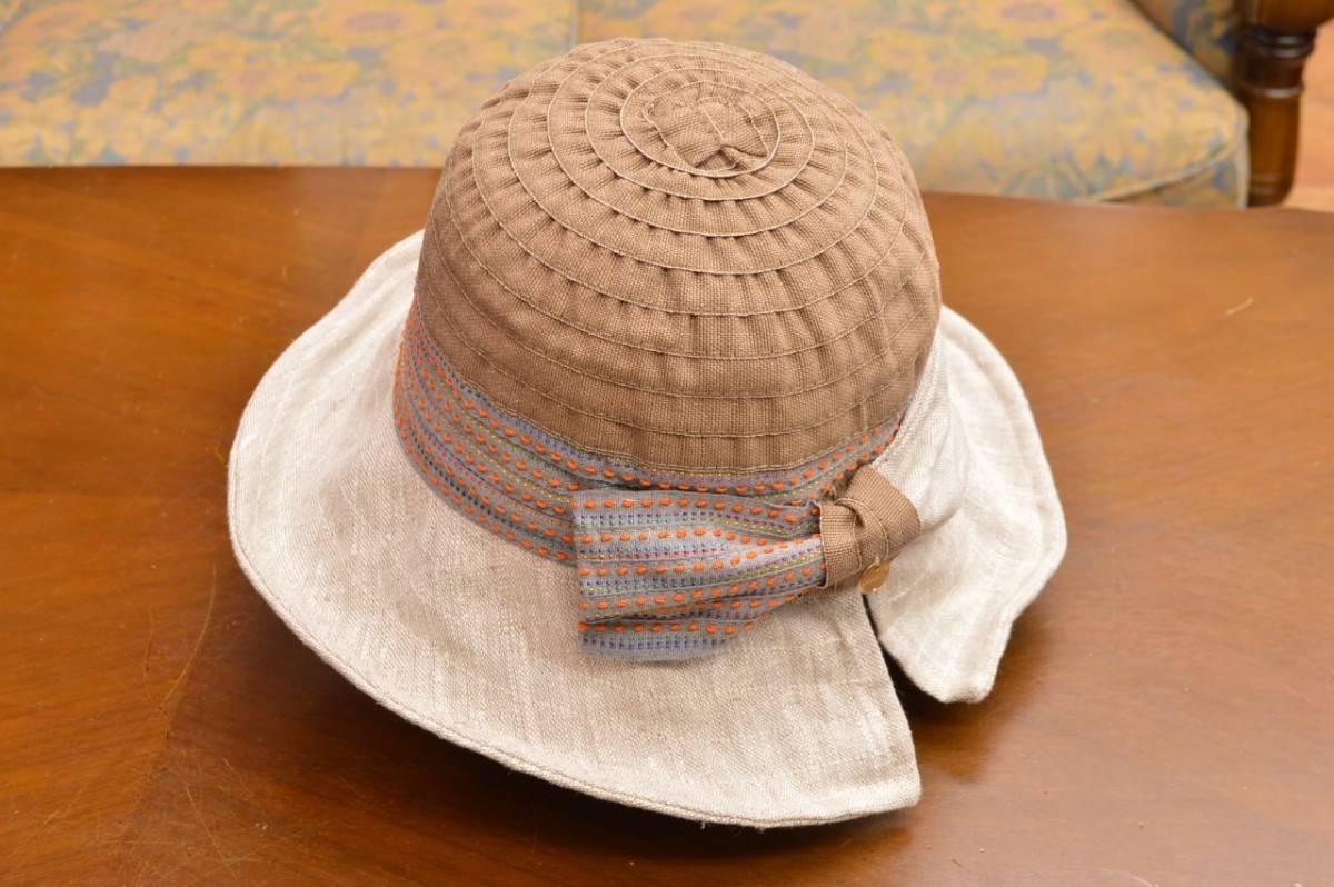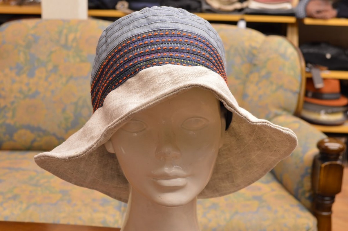クラウン部分はブレード編み、ブリム部分は麻素材を使用したワイヤーブリム仕様で、デザインクロッシェならではのラインフォルムが独特な雰囲気をかもし出します。
