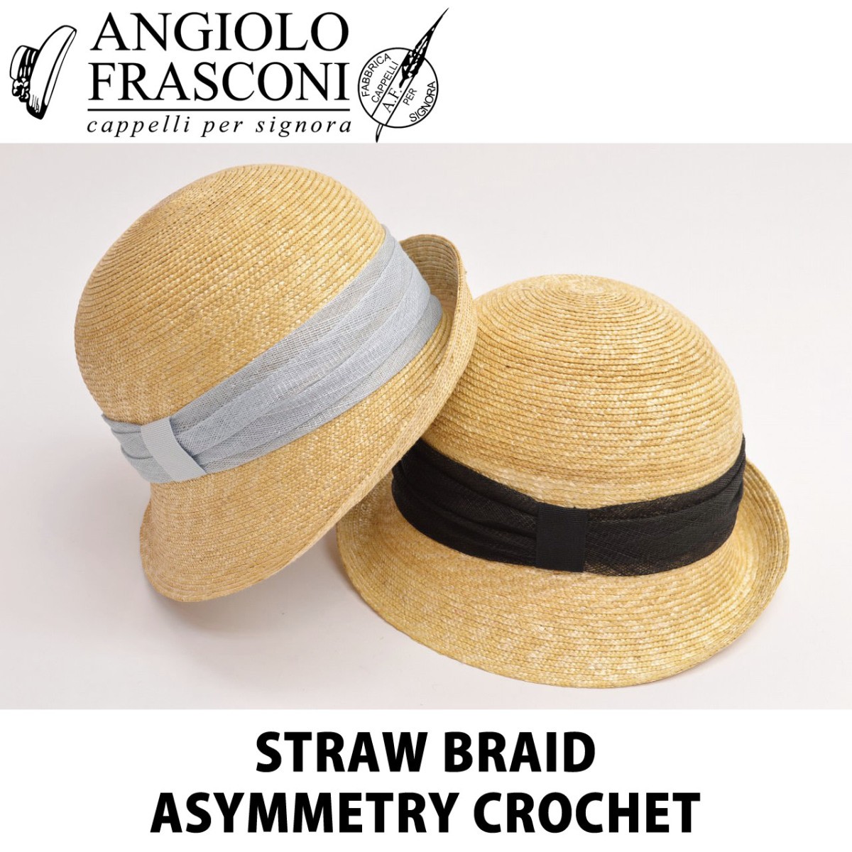 ファッション発信地、イタリア、フィレンツェ ANGIOLO FRASCONI アンジオーロ フラスコーニ からの、麦わら帽 天然草ストロー ブレード アシンメトリ シナマイリボン クロシェです。