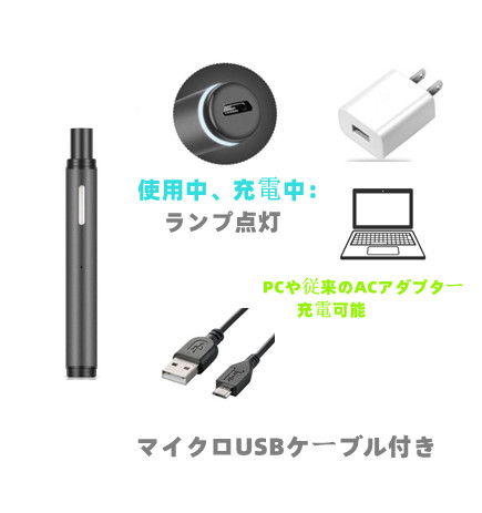 ◎キャップ付きなので、ニオイや残りカスなどを気にせず済むから携帯する時にとっても安心で清潔です。 ◎大容量400mAhバッテリー。※吸い方により個人差があります ◎オートスイッチ機能搭載なので、ボタン操作一切なし。 ◎USBチャージャー付きなのでPCやモバイルバッテリーなど 充電可能 ◎充電中は底部のランプが白色に点灯します。※フル充電は約60分 ◎製品仕様(一本分) ●サイズ:約 H12.6 x W1.4 x D1.4 cm(キャップ装着時) ●重量:約 25g(キャップ装着時) ●USBコード長:約 28.5 cm ●バッテリー容量:400mAh ●フル充電時間:約 60分 持ち運び便利
