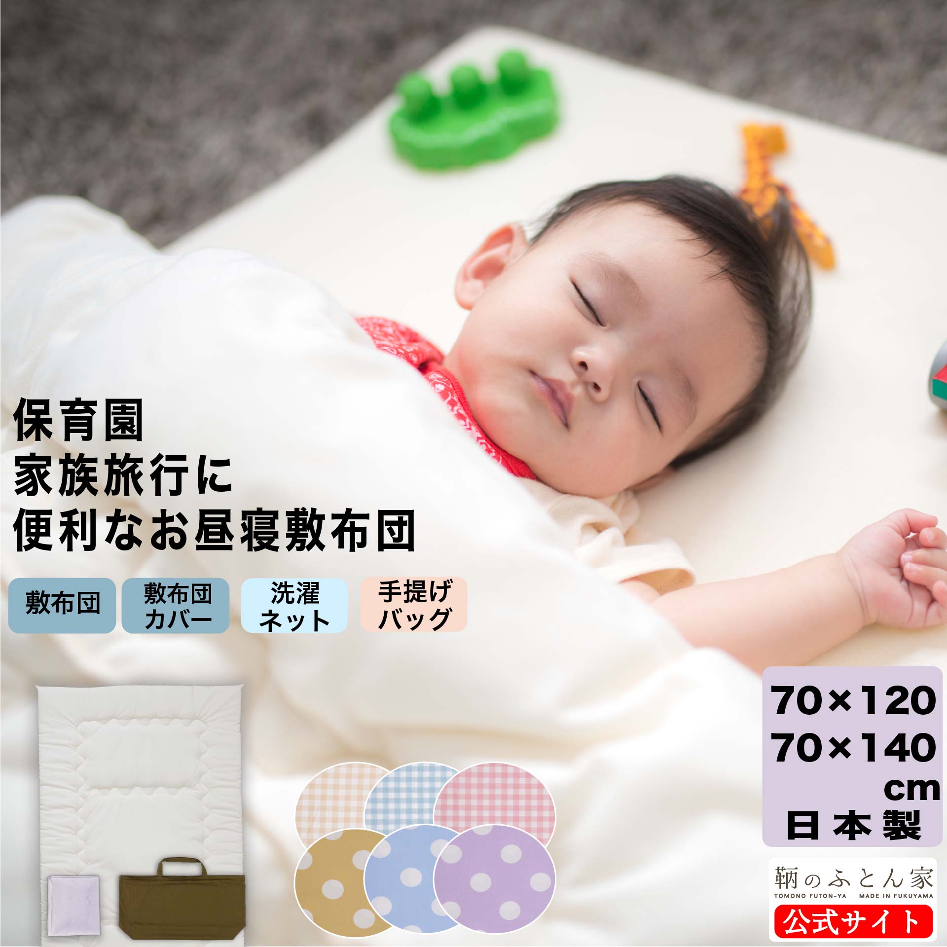 | 家庭でじゃぶじゃぶ洗える お昼寝布団 敷き布団 日本製 保育園・帰省・旅行などのちょっとしたお昼寝や布団に最適です。 カバーは、敏感肌におすすめの綿100%のブロード生地 |