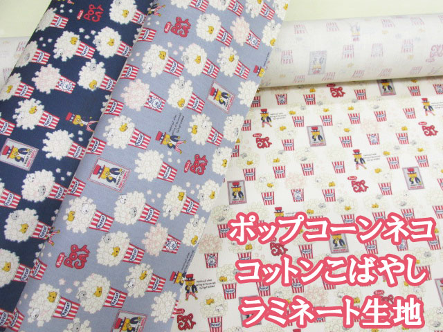 ポップコーンネコ ポップコーン・ネコ・猫柄 綿キャンバス生地 ラミネート つや消し コットンこばやし