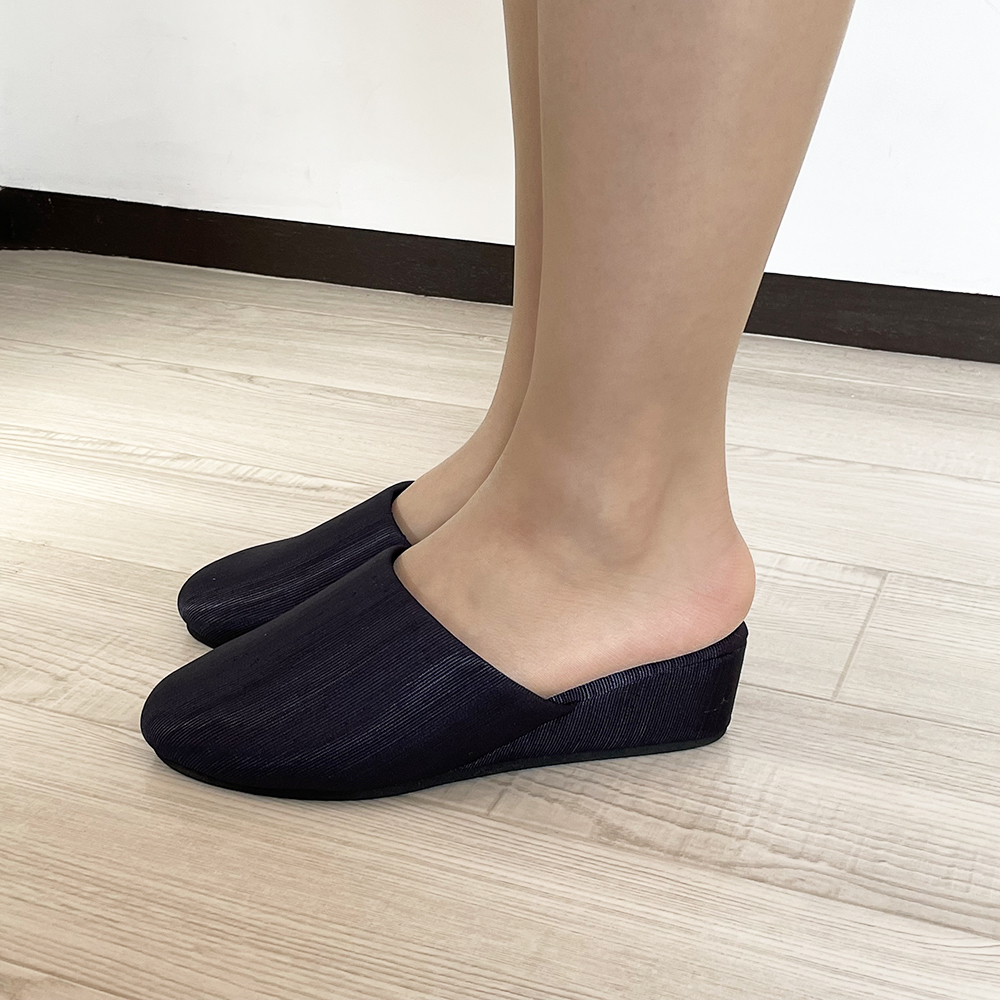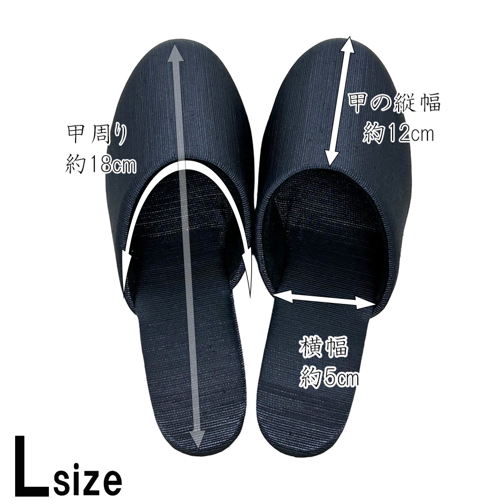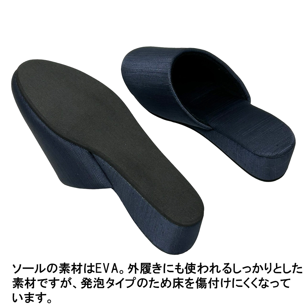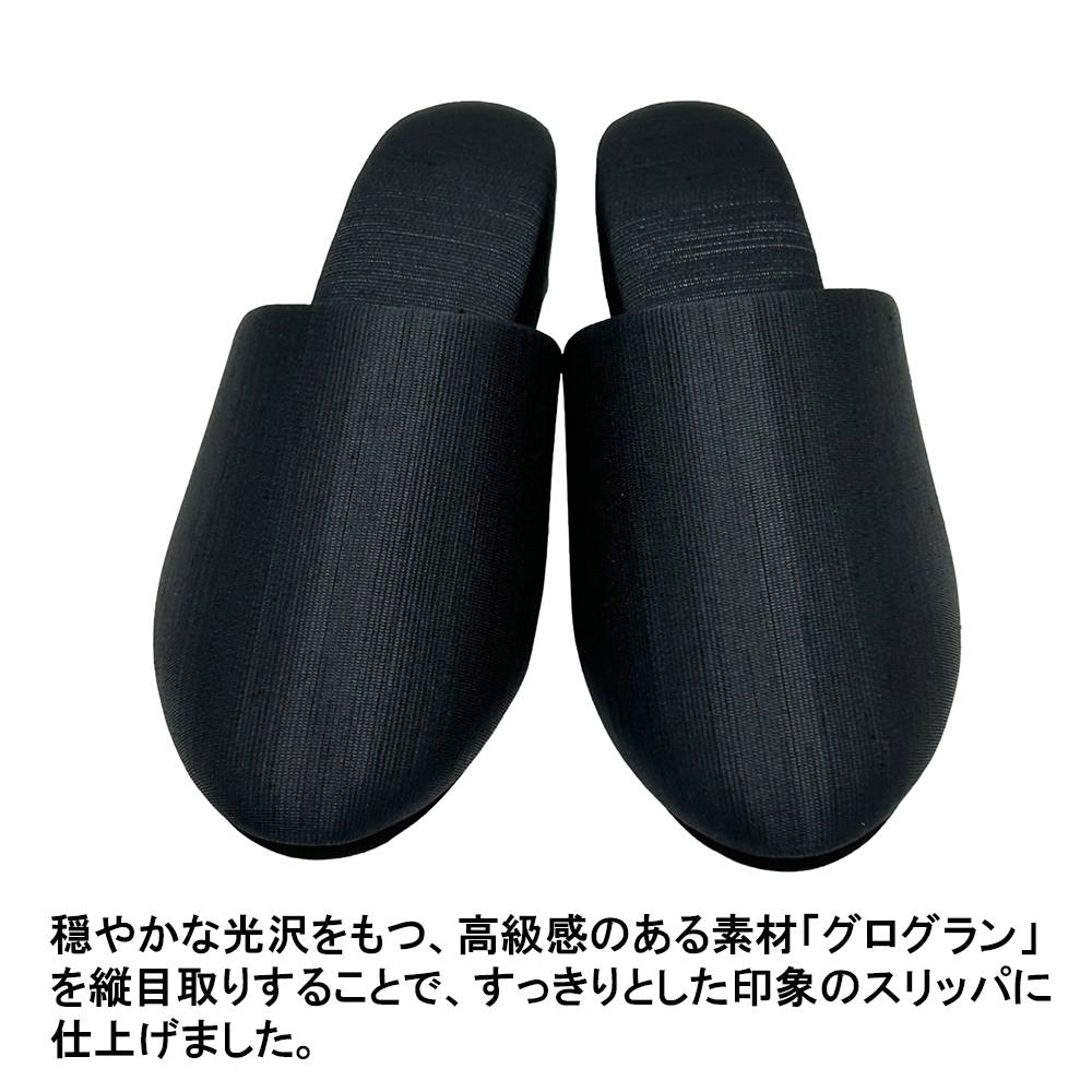 すっきりシンプルで、フォーマル感バツグン。でもシンプルなだけじゃない!動くたびにキラリと、でも決して派手でない上品な光沢が踊ります。この畝を縦目に使用することで、つま先に向かってすっとしたスマートなデザインに仕上がりました。学校訪問やお受験・面接など、フォーマルな場面ではシンプルな服装になることが多いもの。足元にこのような適度な光沢を加えることで、野暮ったさのない、上質なコーディネイトを実現できます。またほこりがつきにくく、ついても落としやすい素材。かかとの高さは約4.5〜5cm。パンツの裾を引きずらず、立ち姿をすっきり見せてくれるヒールスリッパです。ソールの素材はEVA。発泡タイプのため床を傷付けにくくなっています。S・M・Lの3サイズ展開。甲には固い芯地を使っておらずややソフトで、足の形に合わせてカーブをつけたフィット感のあるデザインなので、サイズに悩まれる場合、また幅広・甲高・外反母趾タイプさんの場合は、シルエットに響かないようひとつ上のサイズをお選びいただくと無難です。