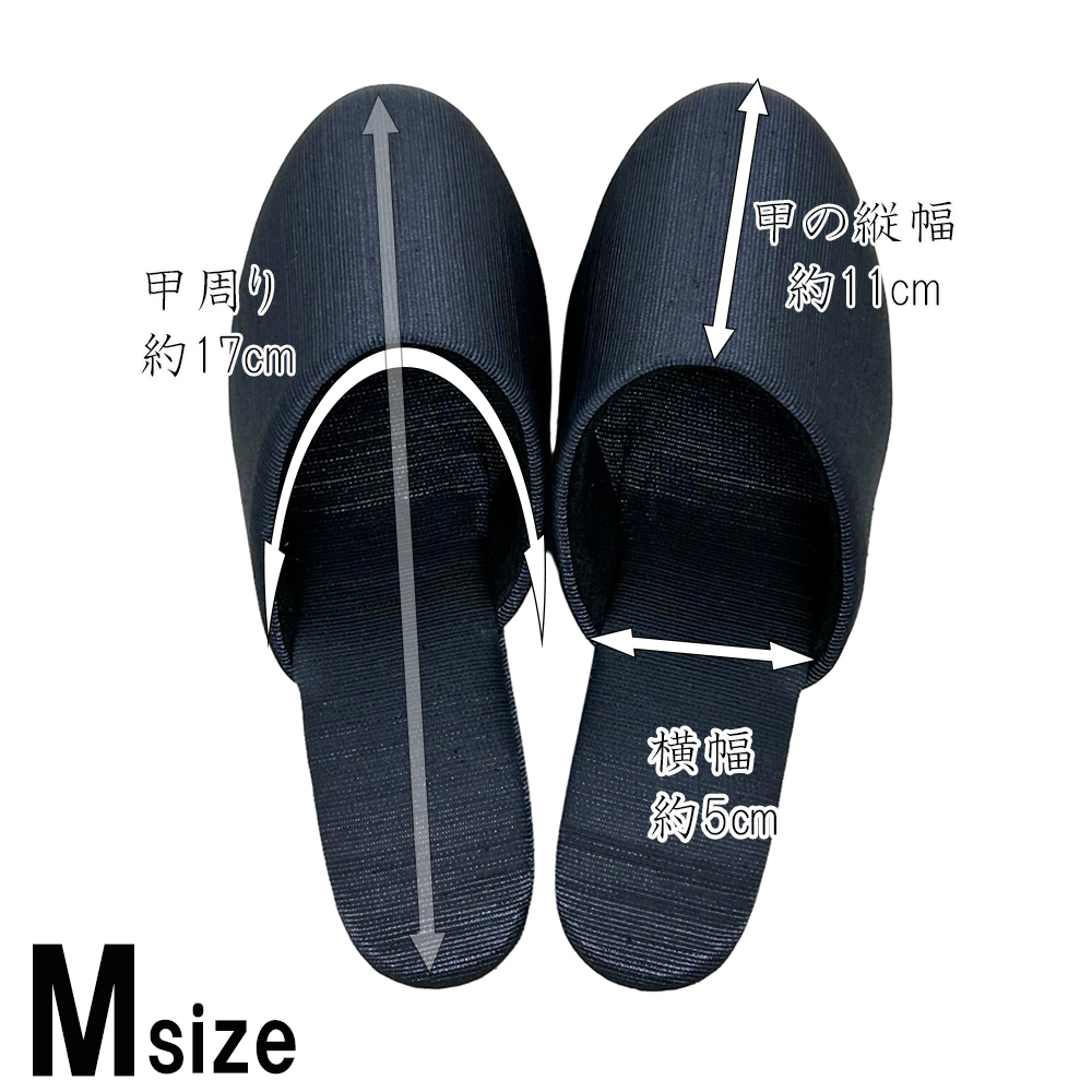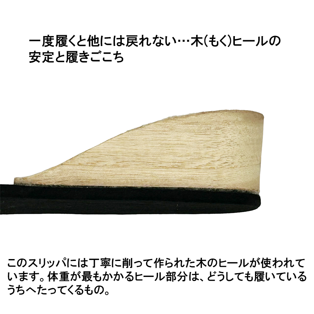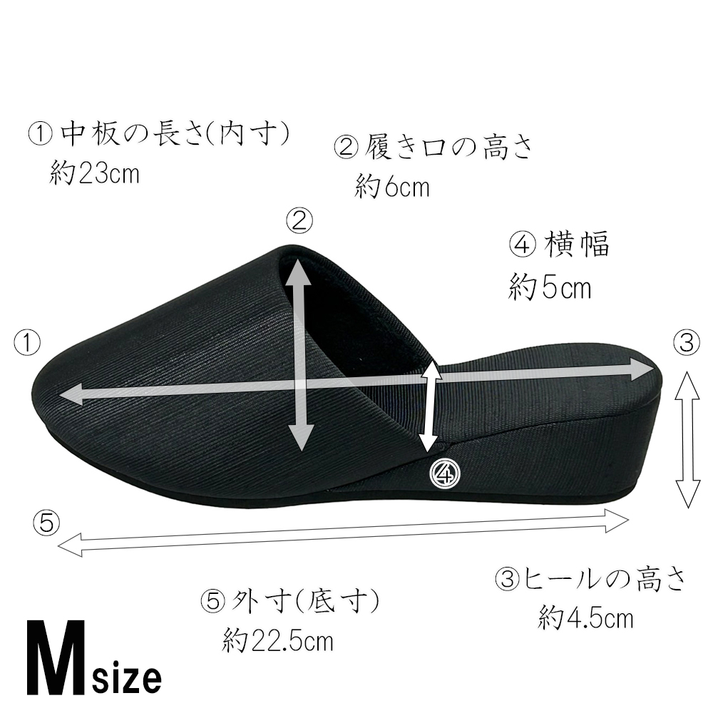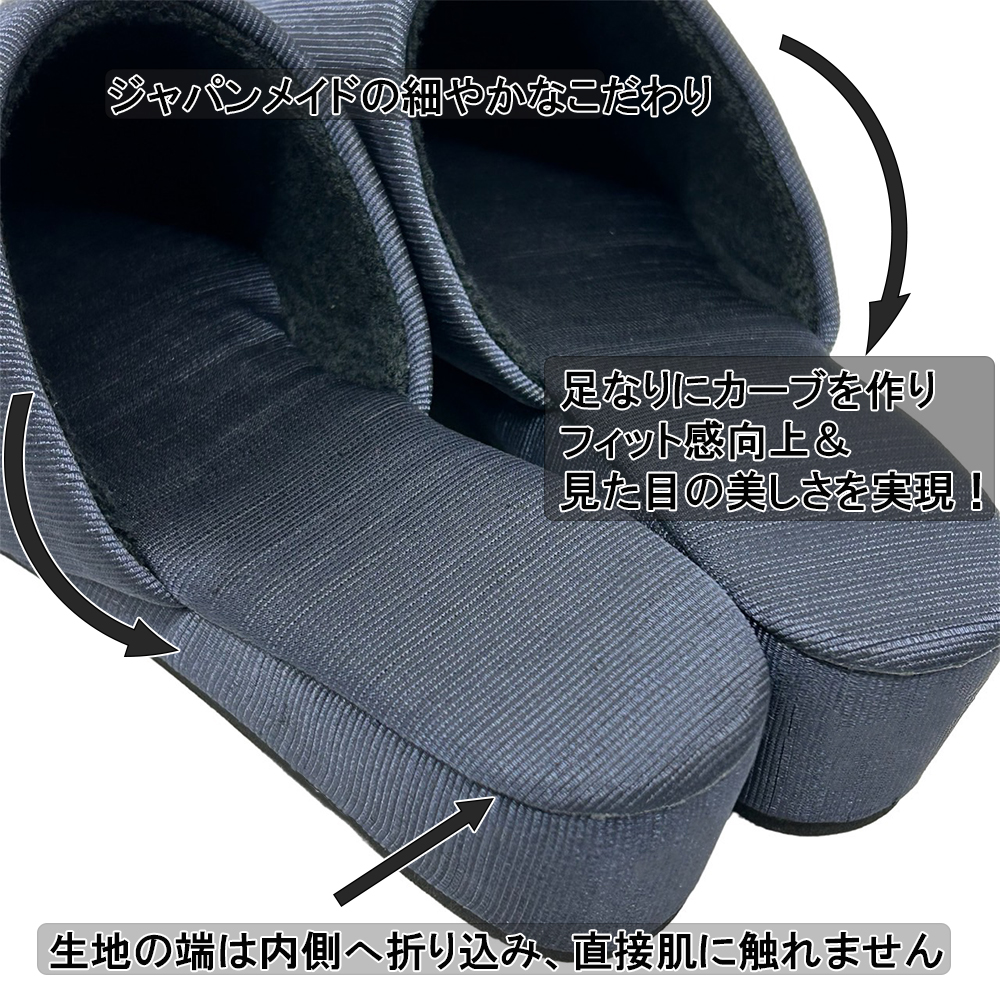 すっきりシンプルで、フォーマル感バツグン。でもシンプルなだけじゃない!動くたびにキラリと、でも決して派手でない上品な光沢が踊ります。この畝を縦目に使用することで、つま先に向かってすっとしたスマートなデザインに仕上がりました。学校訪問やお受験・面接など、フォーマルな場面ではシンプルな服装になることが多いもの。足元にこのような適度な光沢を加えることで、野暮ったさのない、上質なコーディネイトを実現できます。またほこりがつきにくく、ついても落としやすい素材。かかとの高さは約4.5〜5cm。パンツの裾を引きずらず、立ち姿をすっきり見せてくれるヒールスリッパです。ソールの素材はEVA。発泡タイプのため床を傷付けにくくなっています。S・M・Lの3サイズ展開。甲には固い芯地を使っておらずややソフトで、足の形に合わせてカーブをつけたフィット感のあるデザインなので、サイズに悩まれる場合、また幅広・甲高・外反母趾タイプさんの場合は、シルエットに響かないようひとつ上のサイズをお選びいただくと無難です。