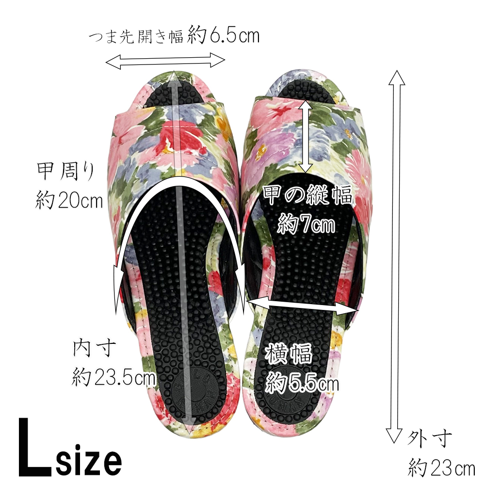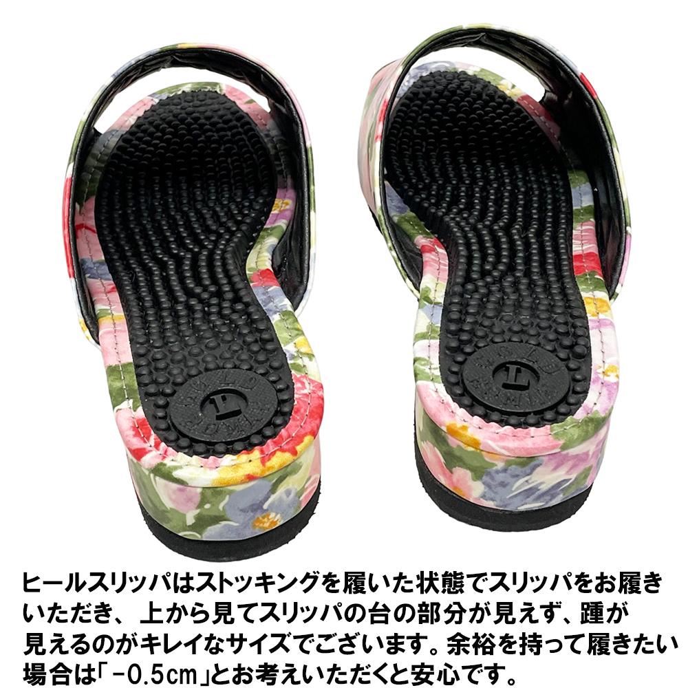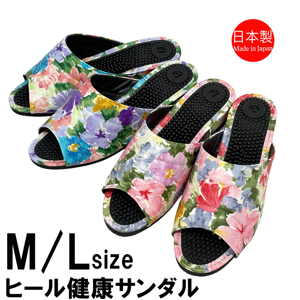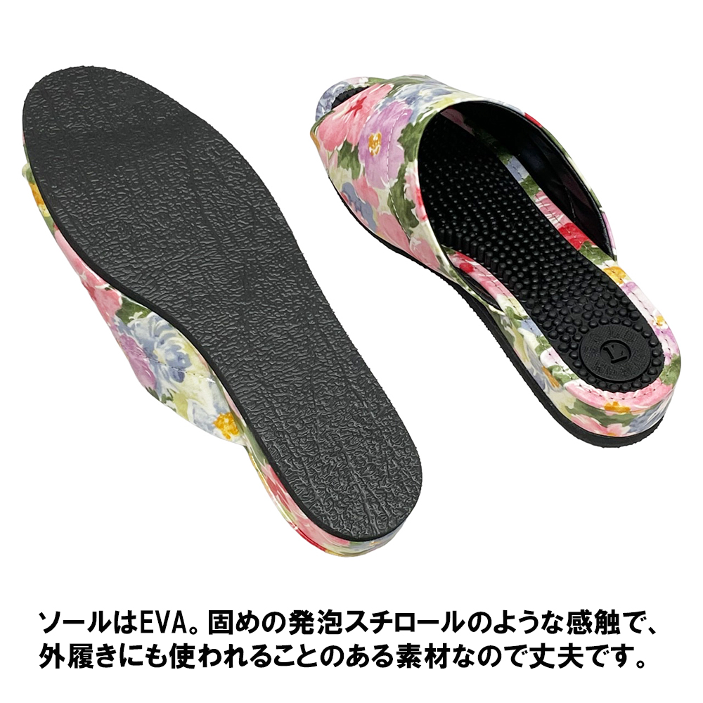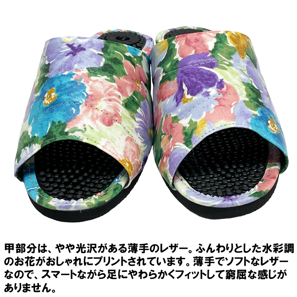 普通の健康サンダルはカジュアルすぎて…。エレガントなデザインのものってないかしら?そんな方におすすめの3cmヒールのスマートな健康サンダルです。内外兼用なので、オフィス履きに、ベランダやお庭履きに、ちょっとそこまで履きに…などなど、当店の実店舗でも愛用者の多い一足です。甲部分は、やや光沢がある薄手のレザー。ふんわりとした水彩調のお花がおしゃれにプリントされています。薄手でソフトなレザーなので、スマートながら足にやわらかくフィットして窮屈な感じがありません。外反母趾や幅広タイプさんにも、快適に履いていただくことができます。またビニールレザーは水を弾きやすい性質があり、もちろん水拭きOK。