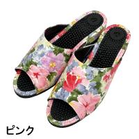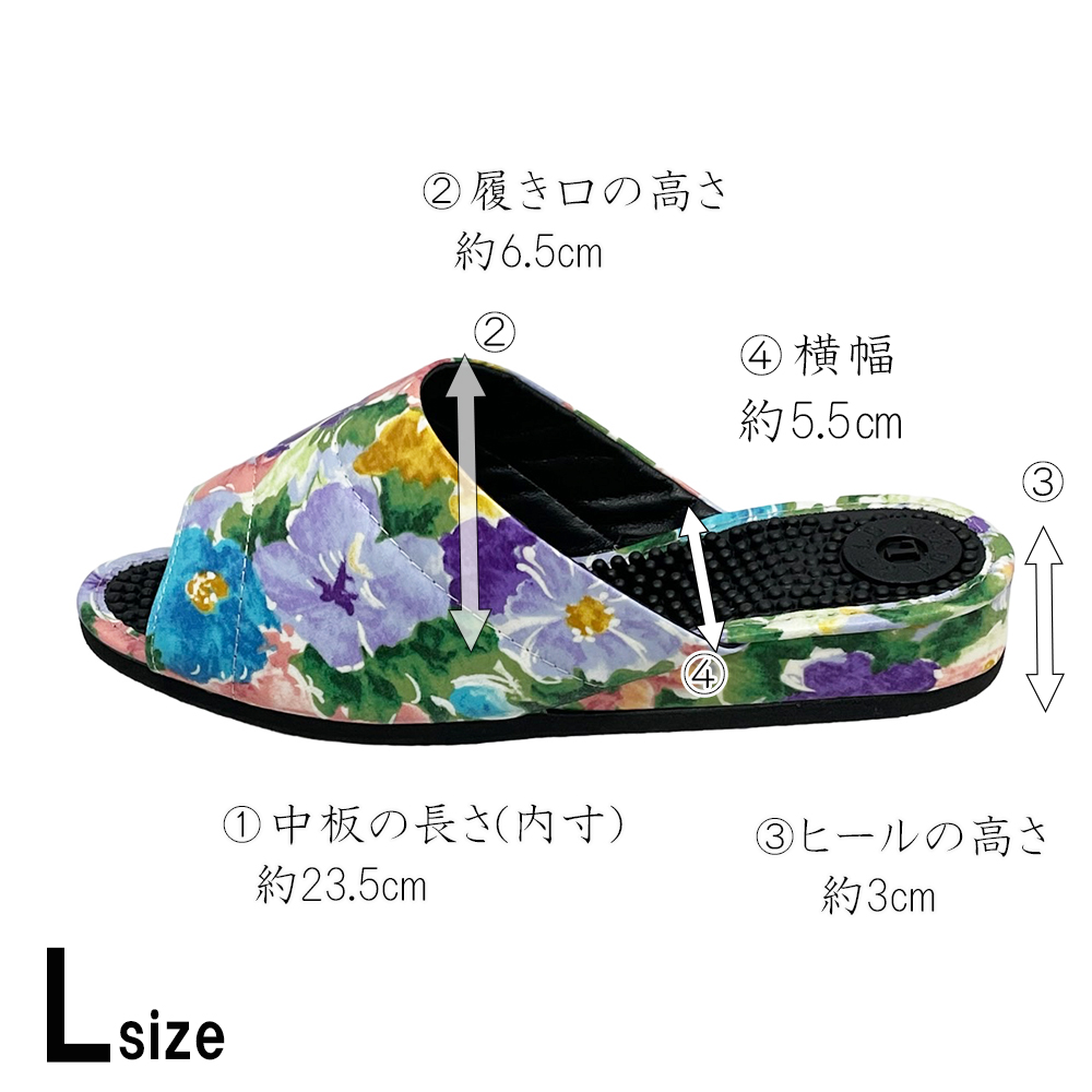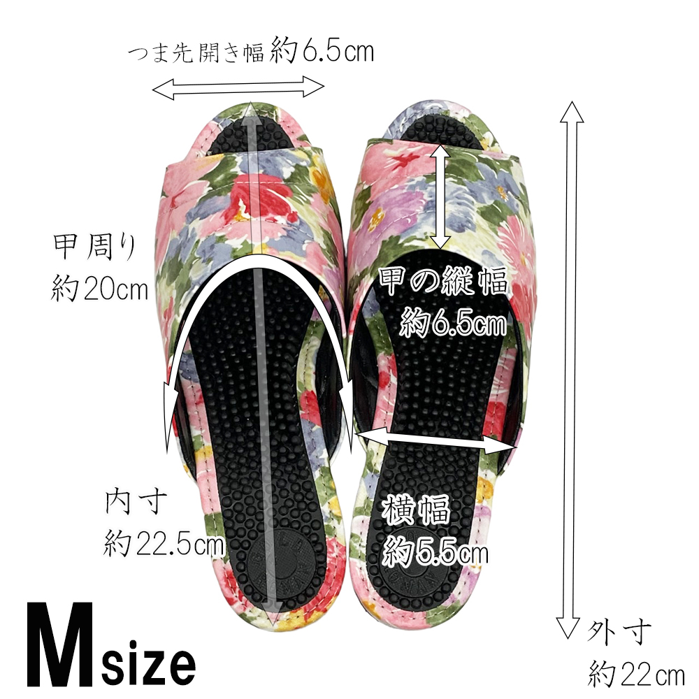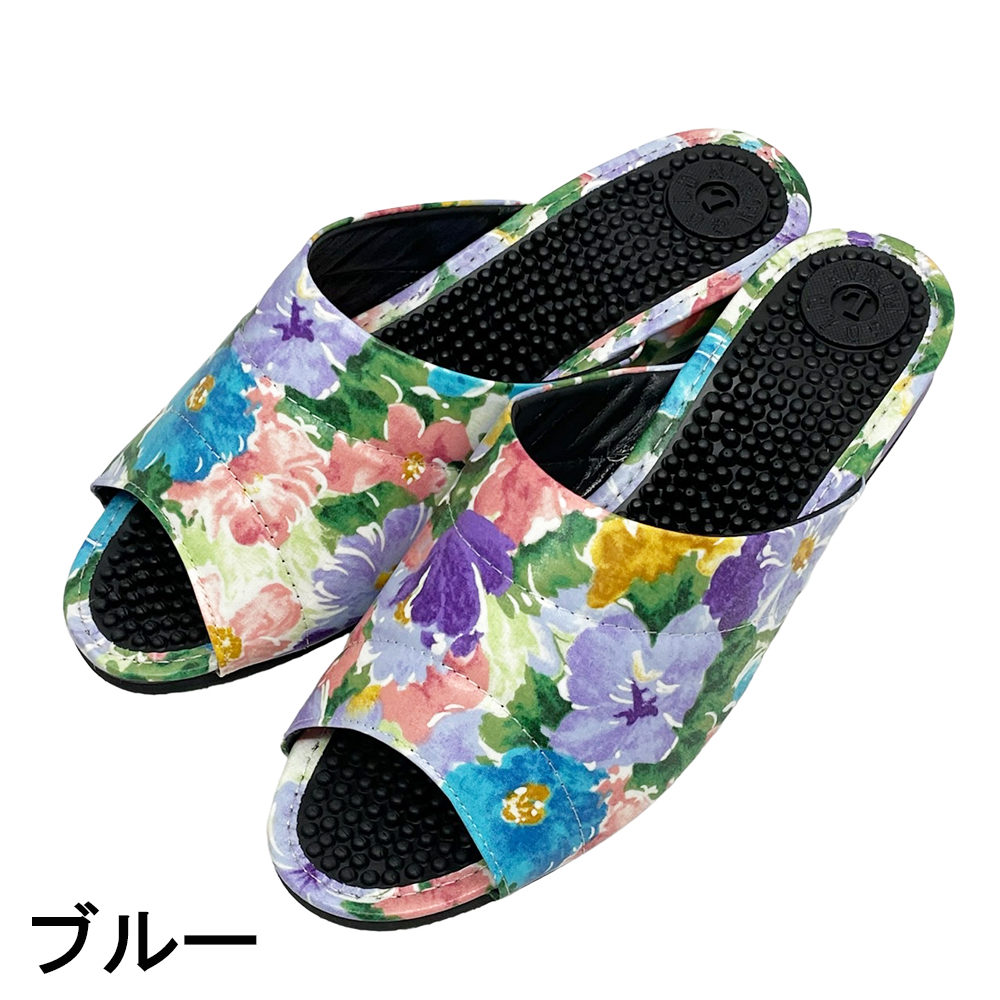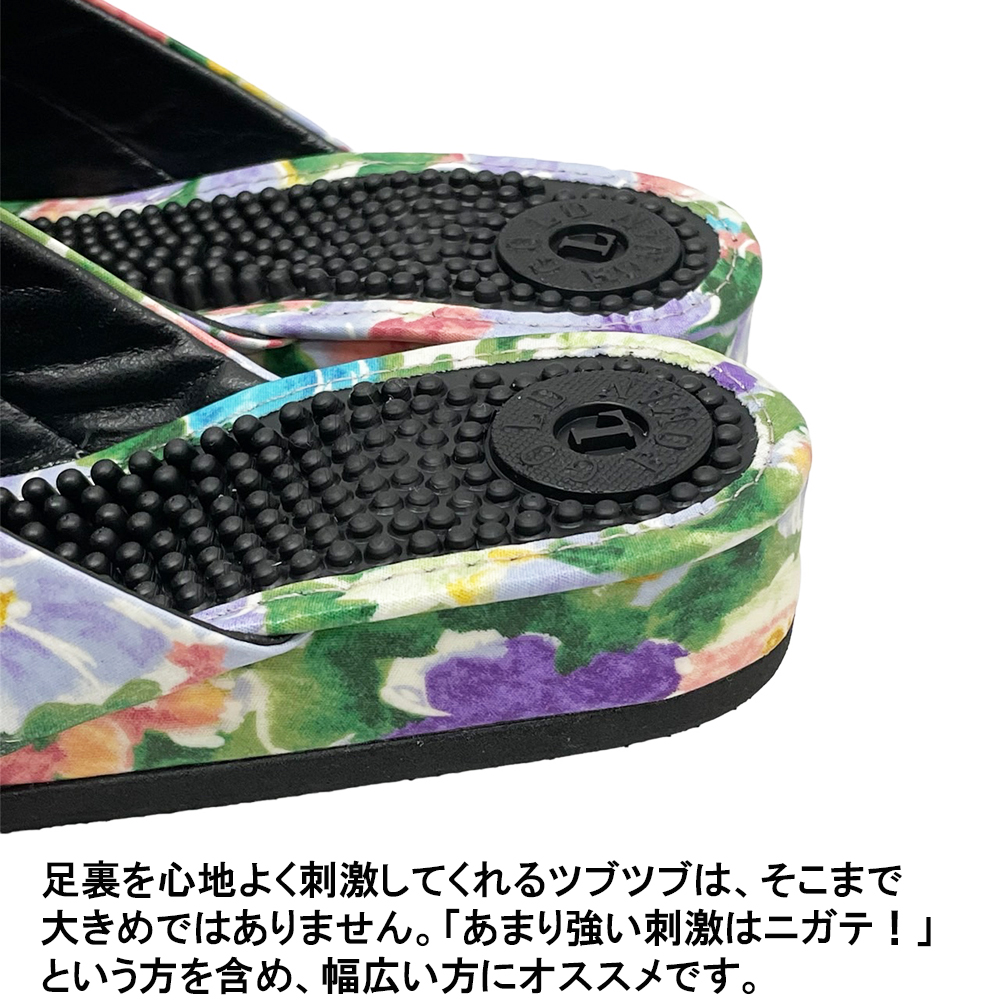 普通の健康サンダルはカジュアルすぎて…。エレガントなデザインのものってないかしら?そんな方におすすめの3cmヒールのスマートな健康サンダルです。内外兼用なので、オフィス履きに、ベランダやお庭履きに、ちょっとそこまで履きに…などなど、当店の実店舗でも愛用者の多い一足です。甲部分は、やや光沢がある薄手のレザー。ふんわりとした水彩調のお花がおしゃれにプリントされています。薄手でソフトなレザーなので、スマートながら足にやわらかくフィットして窮屈な感じがありません。外反母趾や幅広タイプさんにも、快適に履いていただくことができます。またビニールレザーは水を弾きやすい性質があり、もちろん水拭きOK。