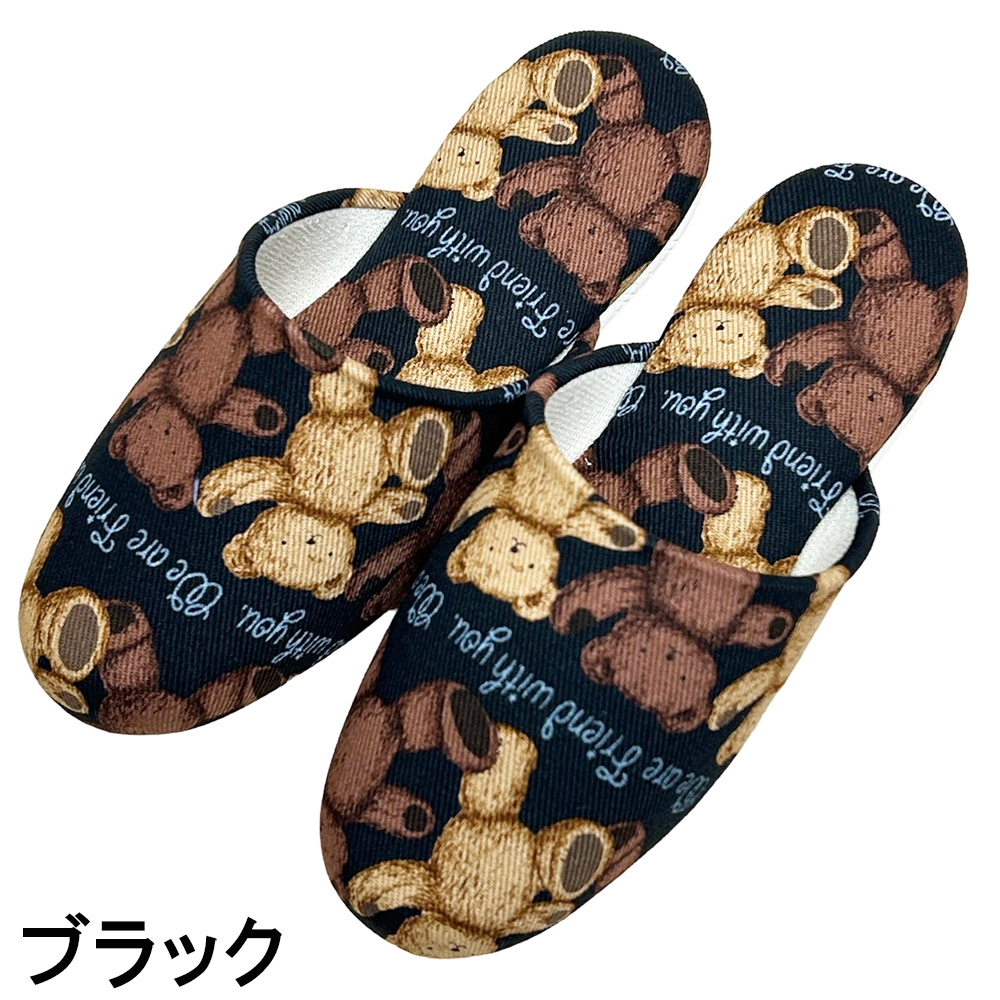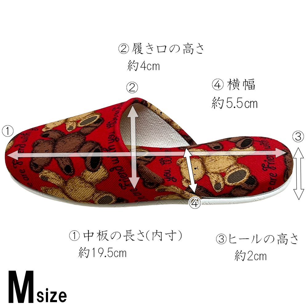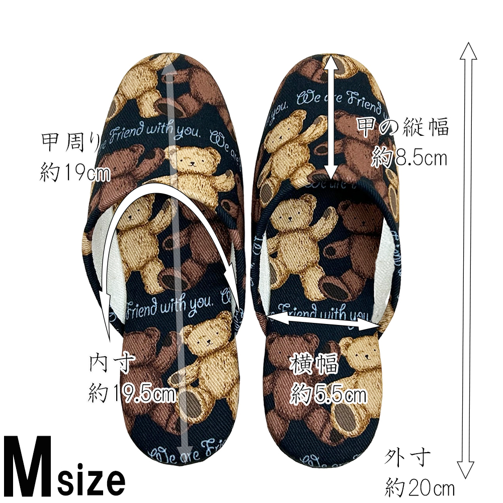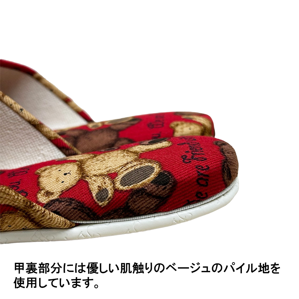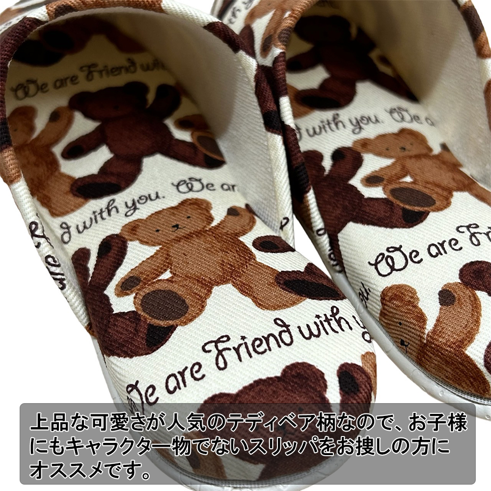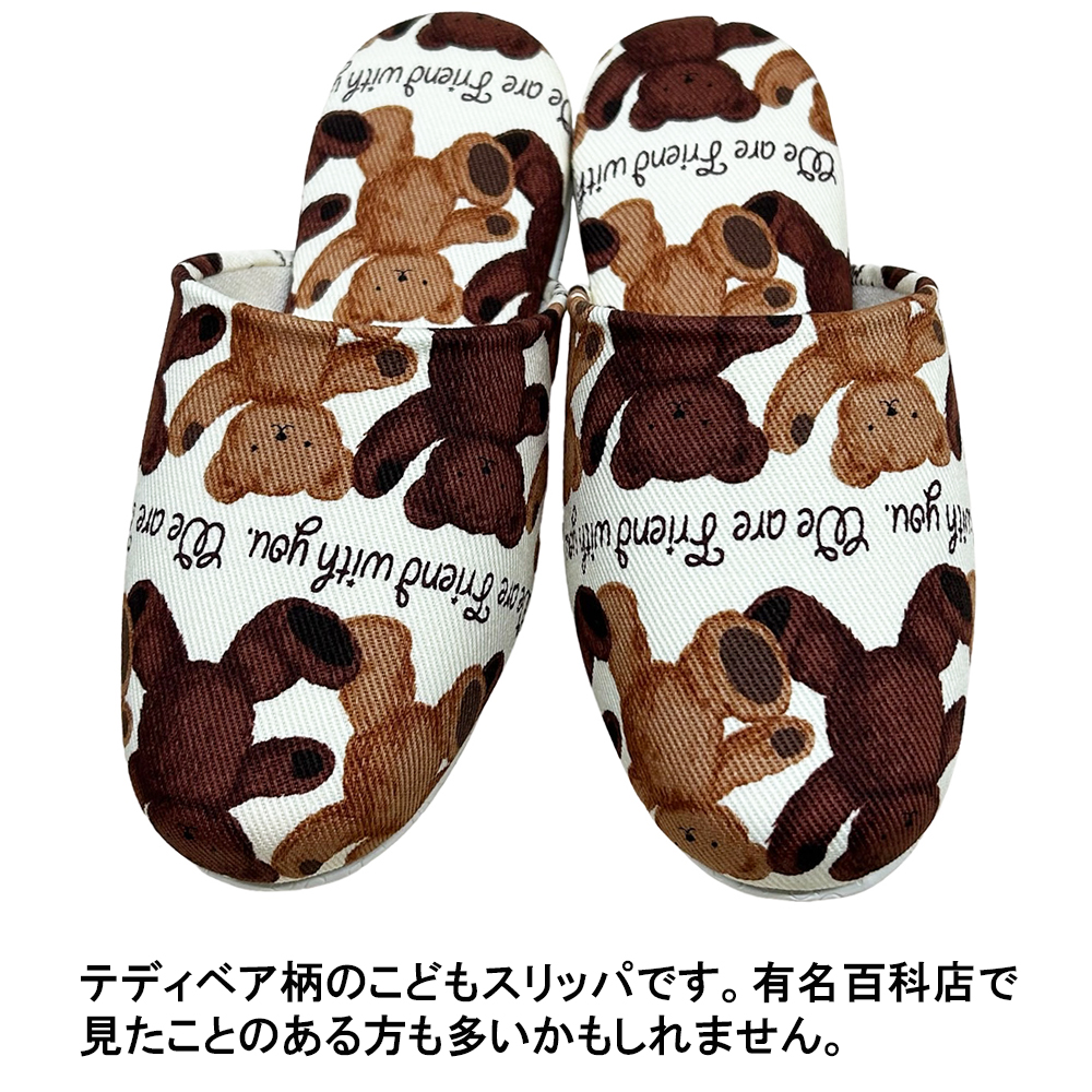 テディベア柄のこども用スリッパです。有名百貨店で見たことのある方も多いかもしれません。甲裏部分には優しい肌触りのベージュのパイル地を使用していて、お子様の肌にやさしい柔らかい肌ざわりです。上品な可愛さが人気のテディベア柄なので、お子様にもキャラクター物でないスリッパをお探しの方にオススメです。ソールはビニールレザー素材。汚れたら水拭きやアルコールでお手入れ可能です。素材自体に滑り止め効果もあるので安心です。モデルルームやサロン等の業務用として、お客様のお子様用にチープ感のない商品をお求めのお客様にも人気です。サイズはキッズMサイズ〜18.5cm程度まで、キッズLサイズ〜20.5cm程度までの2サイズ。