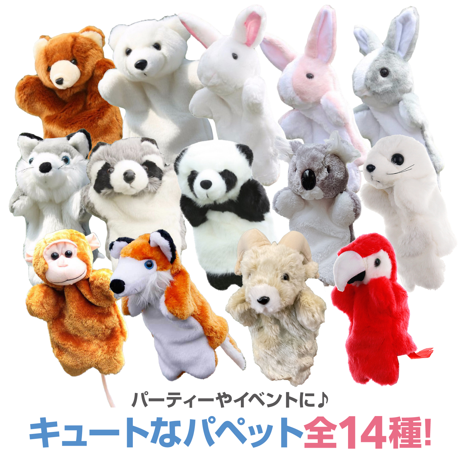 【 可愛いアニマルパペット 】オオカミ うさぎ くま パンダ 白熊 コアラなど、ふわふわ もこもこの触り心地が楽しいぬいぐるみ ハンドパペット。
