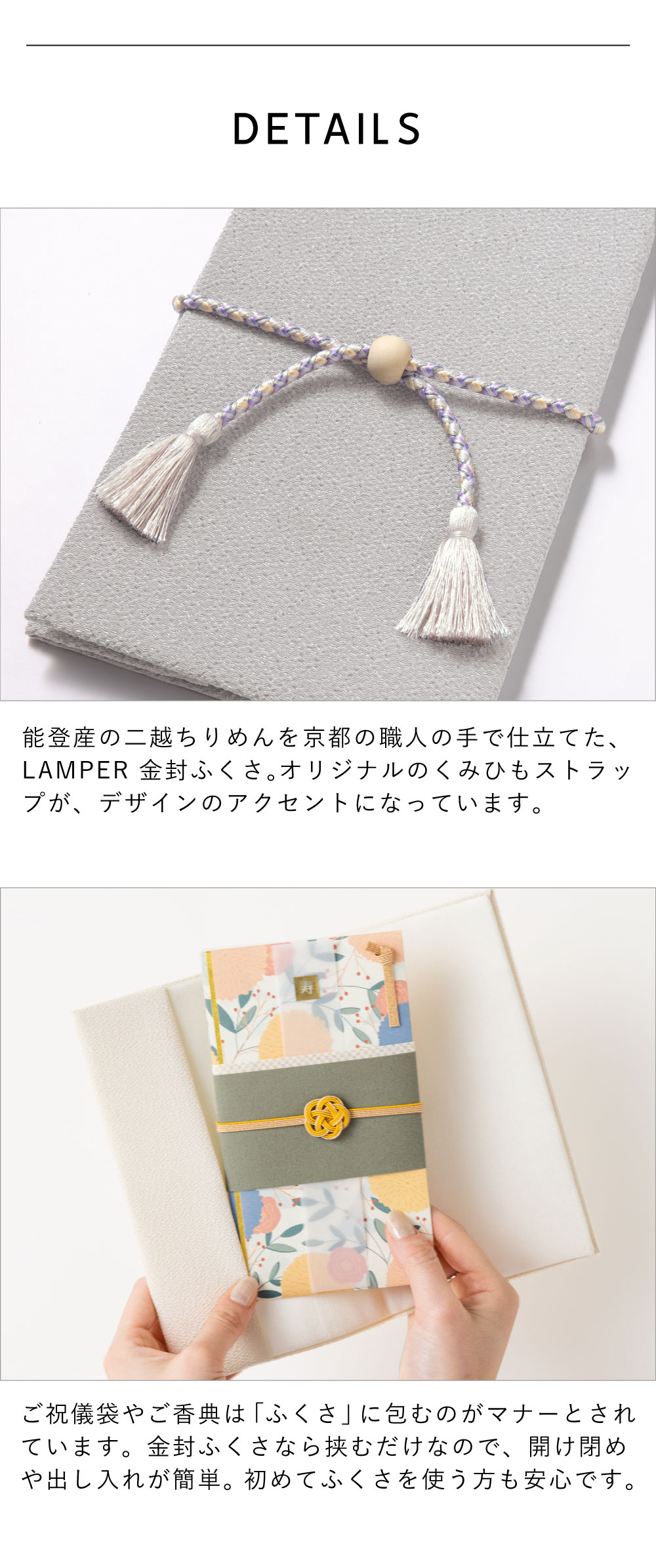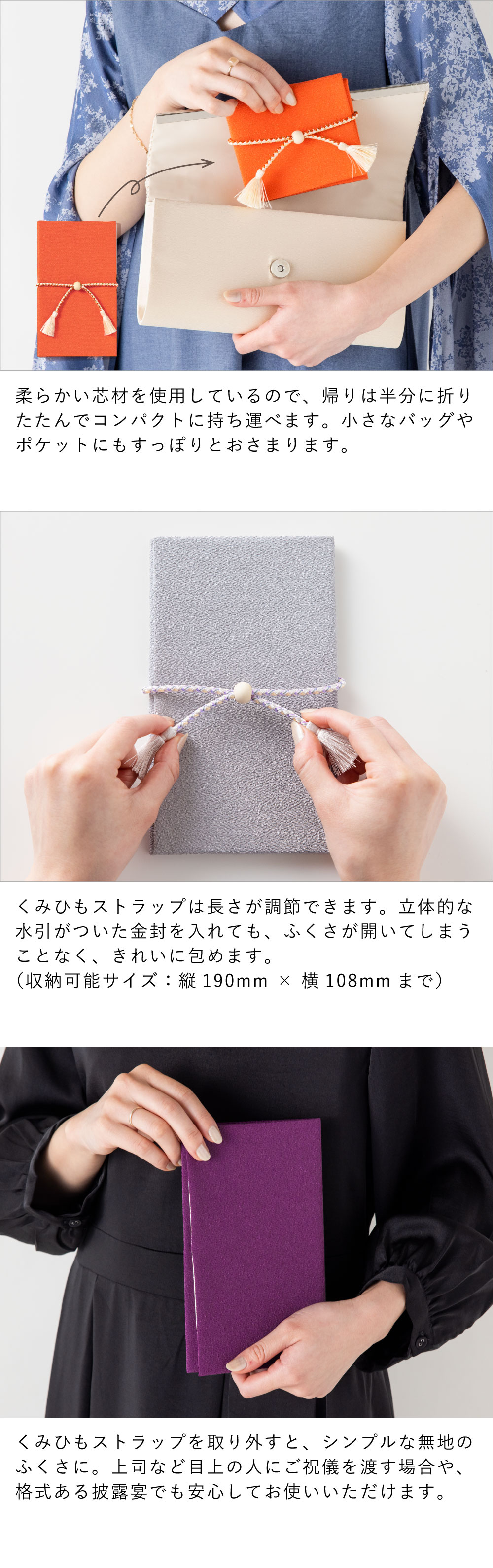 | 素材 | ふくさ:能登二越ちりめん くみひもストラップ:ポリエステル糸、木玉 パッケージ:紙、PET |