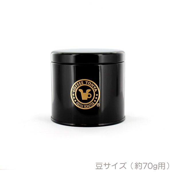 シックな黒色に金色の問屋ロゴが入った缶キャニスターです。当店の焙煎したて珈琲は、是非この缶で保存を!