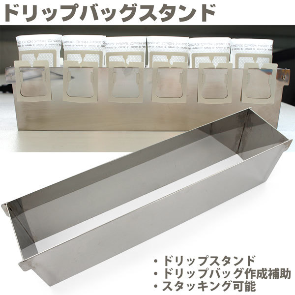 ドリップバッグ作成補助器同時に複数のドリップバッグ作成を補助します。逆台形で使用し、ドリップバッグを引っ掛けた時に下側のサイズが小さくなっているので、引っ掛けた時に外れにくくなります。