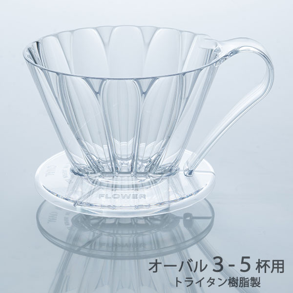 フラワー台形ドリッパー 3-5杯用 カラー:クリア世界で一番最初に円すい形のコーヒーフィルターペーパーを開発したCAFEC(三洋産業)が、CAFECの抽出理論を具現化したフラワー形状と、扇形(台形)ドリッパーを融合させた、フラワードリッパーオーバルです。コーヒー粉の膨らみを妨げないフラワーリブと、扇形ならではの一旦湯が溜まる構造により、コーヒー豆のうま味を余すことなく抽出。さらに、ドリッパー底部のリブや抽出穴設計の工夫によって、コーヒー粉が詰まることなくスムーズな抽出スピードをキープします。