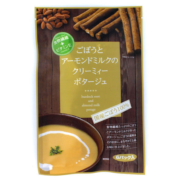 女性に嬉しいポタージュ 6食分入国産ごぼうとアーモンドミルクで作ったポタージュ。ごぼうの風味はそのままに、まろやかで上品な味に仕上げました。食物繊維とビタミンEがたっぷりの女性にうれしいスープです。素材本来の美味しさを大切に作り上げたこだわりの逸品です。