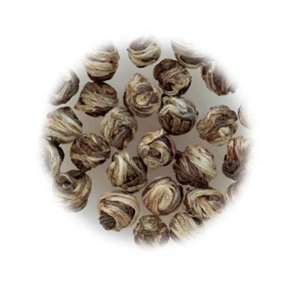 大白種の上質な新芽をひとつずつ手作業で丁寧にまるめた、見た目もかわいらしいお茶。華やかなジャスミンの花の香りづけをしています。