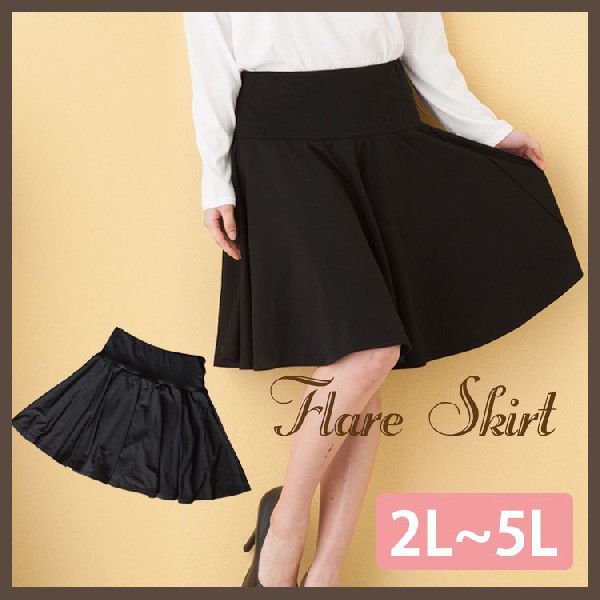 大きいサイズ 2lサイズ レディース スカート フレアースカート ボトムス ハーフ丈 ひざ丈 黒 ブラック ウエストゴム ぽっちゃり 大きなサイズ 2L LL 3L 4L 5L 11号 13号 15号 17号 19号