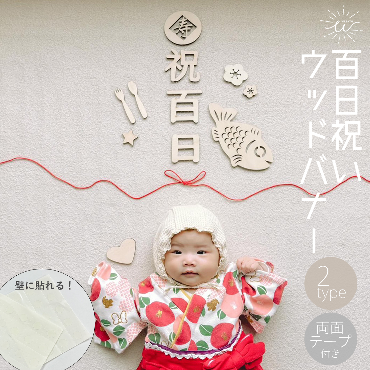 百日祝い 飾り レターバナー 100日祝い 飾り付け お食い初め 撮影 ベビーフォト 赤ちゃん 木製バナー 寝相アート お祝い 紐付き 両面テープ付き 出産祝い