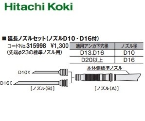| 延長ノズルセット (ノズルD10・D16付) | - | 先端φ23の標準ノズル用 | 315998 |