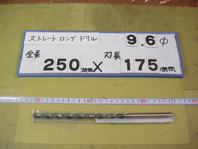 9.6mmの ロングのストレートドリル強力型 日立ツール製 新古品です。 全長250mm 刃長175mmでストレートシャンクです。某社資材部に長年眠っていた品物です。長期保管による外箱や外袋のキズや破損などあります。写真現状有り姿渡しでご入札下さい。