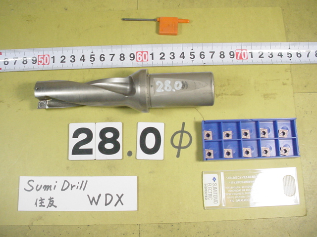 住友イゲタロイ製の フルカットドリル 直径28.0φの中古品で シャンクはサイドロック付きの32φです。型式は WDX280D3S32です。使用できるチップの型式は WDXT073506です。このタイプの新古品チップを1箱おまけしておきます。 品物は写真現状有り姿渡しでご入札下さい。本体もチップも写真に映っているもの有り姿渡しですのでノークレームです。 フル731