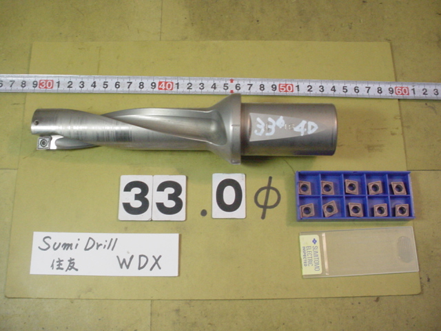 住友イゲタロイ製の フルカットドリル 直径33.0φの中古品で シャンクはサイドロック付きの40φです。型式は WDX330D4S40です。使用できるチップの型式は WDXT094008です。このタイプの新古品チップを1箱おまけしておきます。 品物は写真現状有り姿渡しでご入札下さい。本体もチップも写真に映っているもの有り姿渡しですのでノークレームです。 フル738