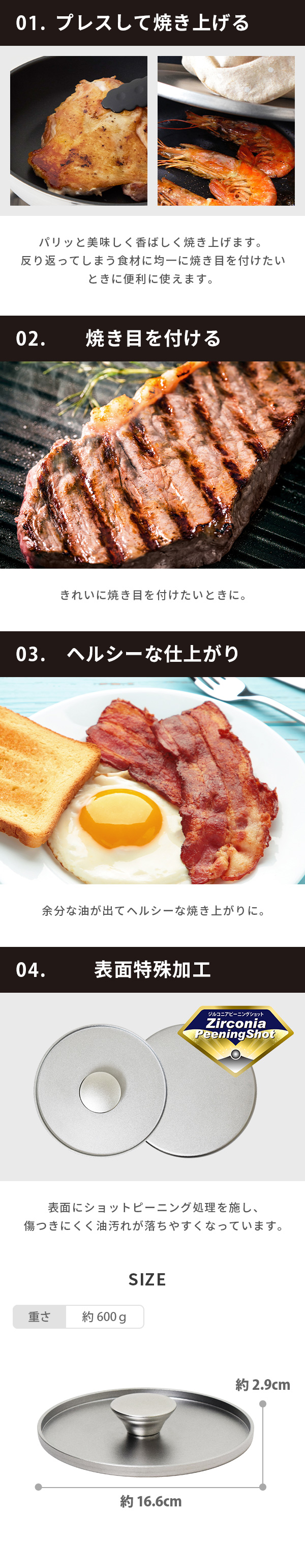 乗せて焼くだけで、本格グリルに仕上がるミートプレスです。反り返ってしまう食材、凹凸のある食材を均一に焼き上げます。食材の上に乗せてプレスすることで、パリッっと美味しく香ばしく焼き上がります。肉の余分な油を落として、ヘルシーに仕上げます。表面はショットピーニング処理が施してあり、傷がつきにくく、油落ちが良く常に清潔に使用できます。
